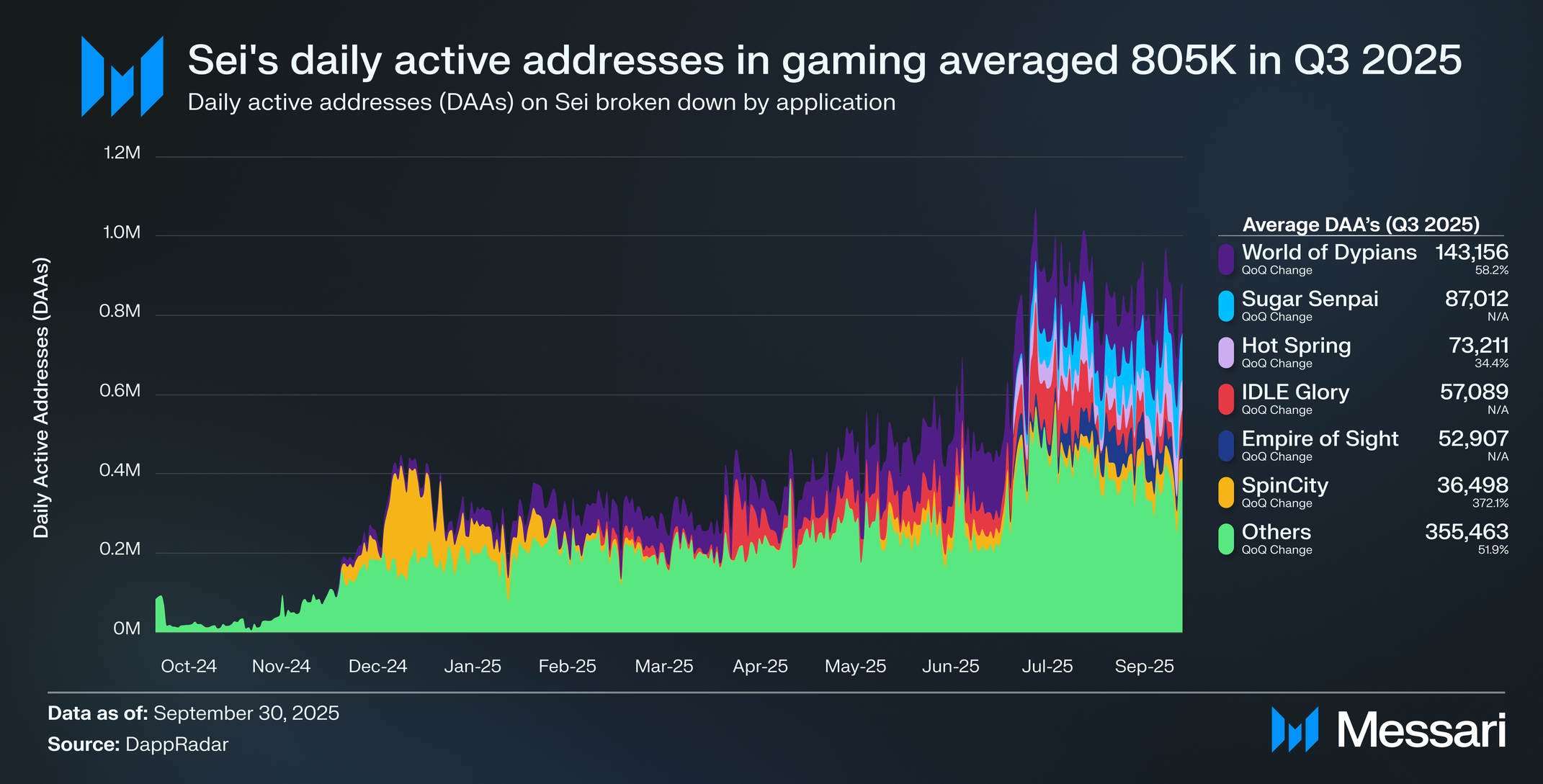 세이의 게이밍 생태계는 2025년 3분기에 계속 번창했으며, 암호화폐 업계에서 선도적인 게이밍 생태계 중 하나가 되었다. 세이는 총 1억 1,600만 건의 게이밍 관련 거래를 달성했으며, 이는 2025년 2분기의 4,880만 건 대비 137.8% 증가한 수치다. 일일 활성 주소(DAAs) 측면에서, 세이의 게이밍 부문 평균 DAAs는 80만 5,000개로 2025년 2분기의 38만 6,700개 대비 전분기 대비 108.2% 증가했다. 월드 오브 디피언스(World of Dypians)는 2025년 3분기 평균 DAAs 기준 선도적인 게임으로 두각을 나타냈고, 슈가 센파이(Sugar Senpai)와 아이들 글로리(IDLE Glory)가 분기 내내 부상했다.