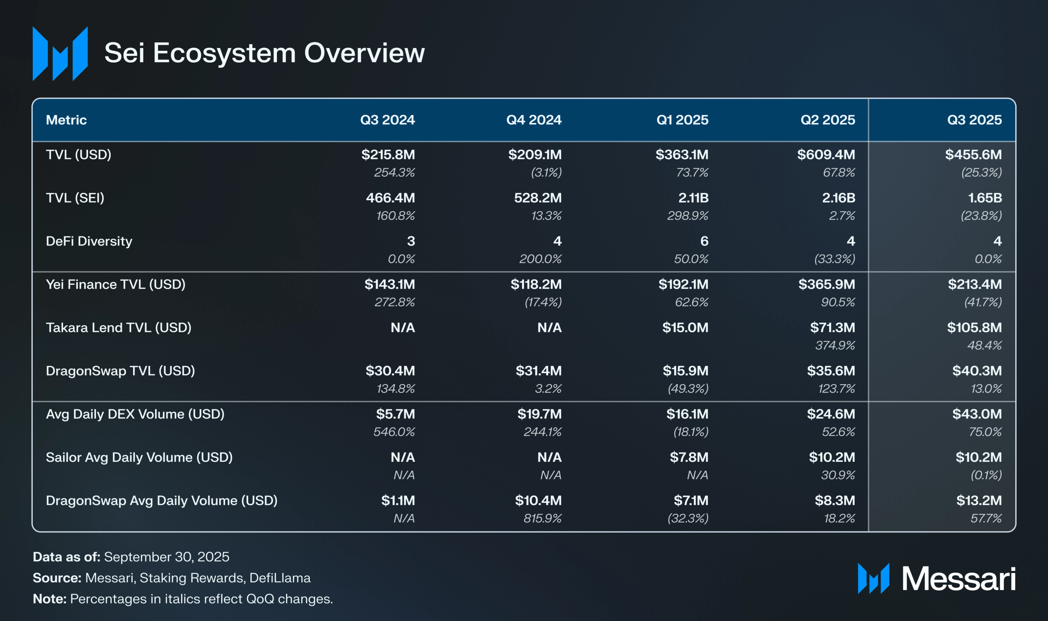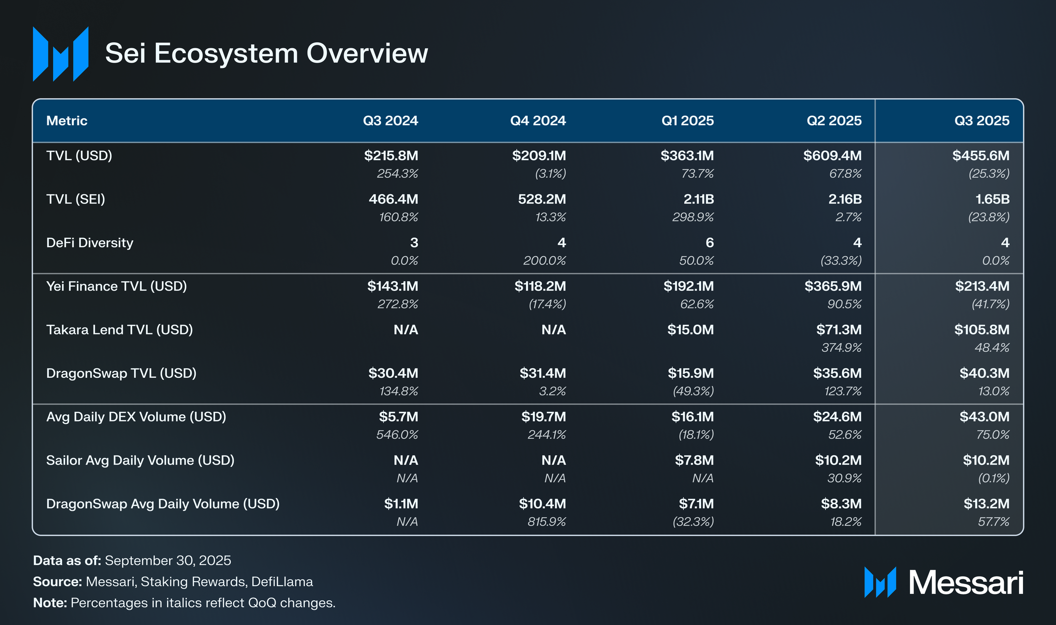 2025년 3분기에 TVL(USD)은 전분기 대비 25.3% 감소한 4억 5,560만 달러를 기록했으며, 2025년 7월 18일에 설정된 사상 최고치인 6억 8,840만 달러 대비 33.8% 감소했다. SEI의 가격이 2025년 3분기에 전분기 대비 1.9% 감소한 0.28 달러로 상대적으로 보합세를 유지하면서, TVL(SEI)은 전분기 대비 23.8% 감소한 16억 5,000만 SEI를 기록했다.