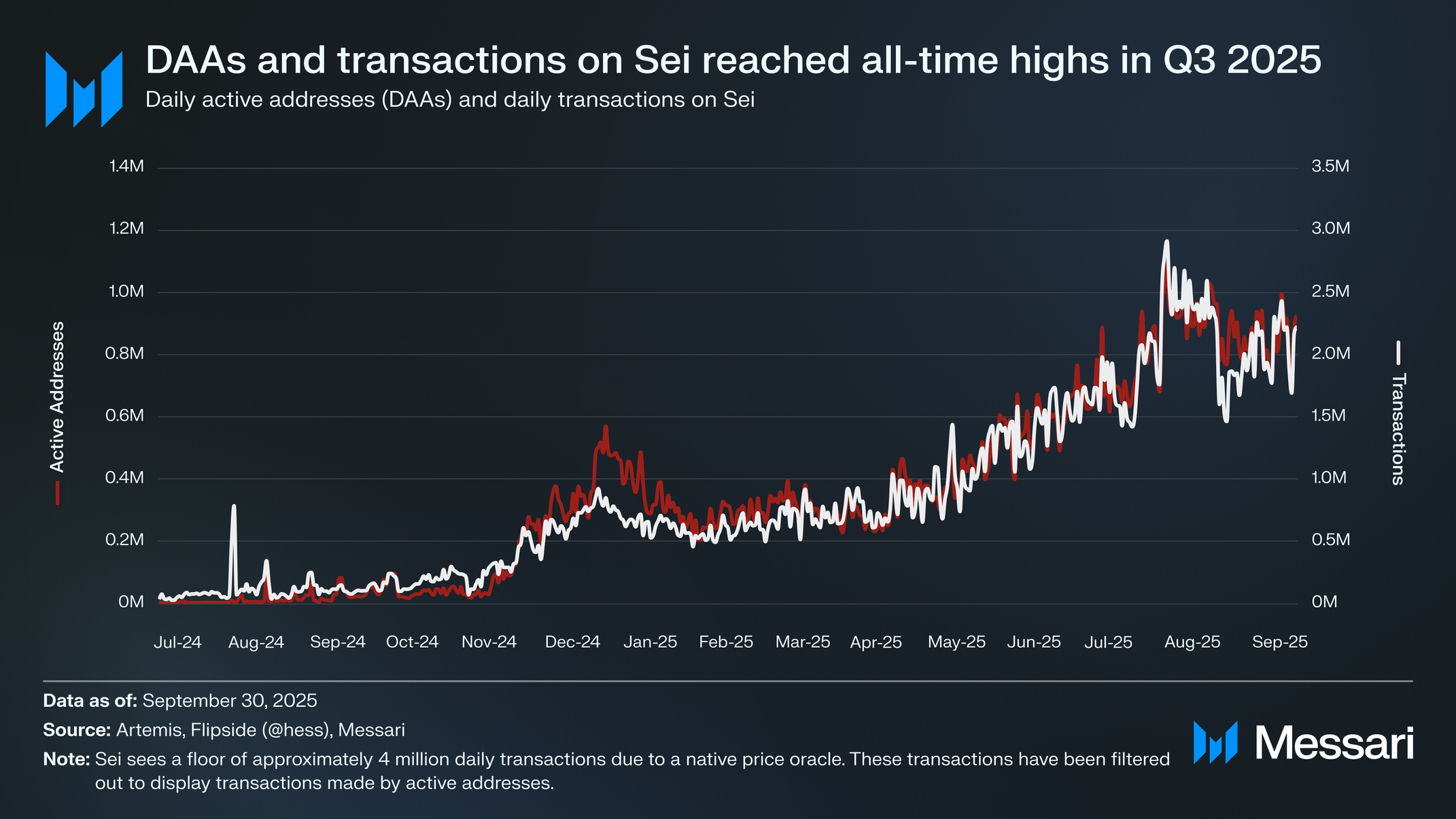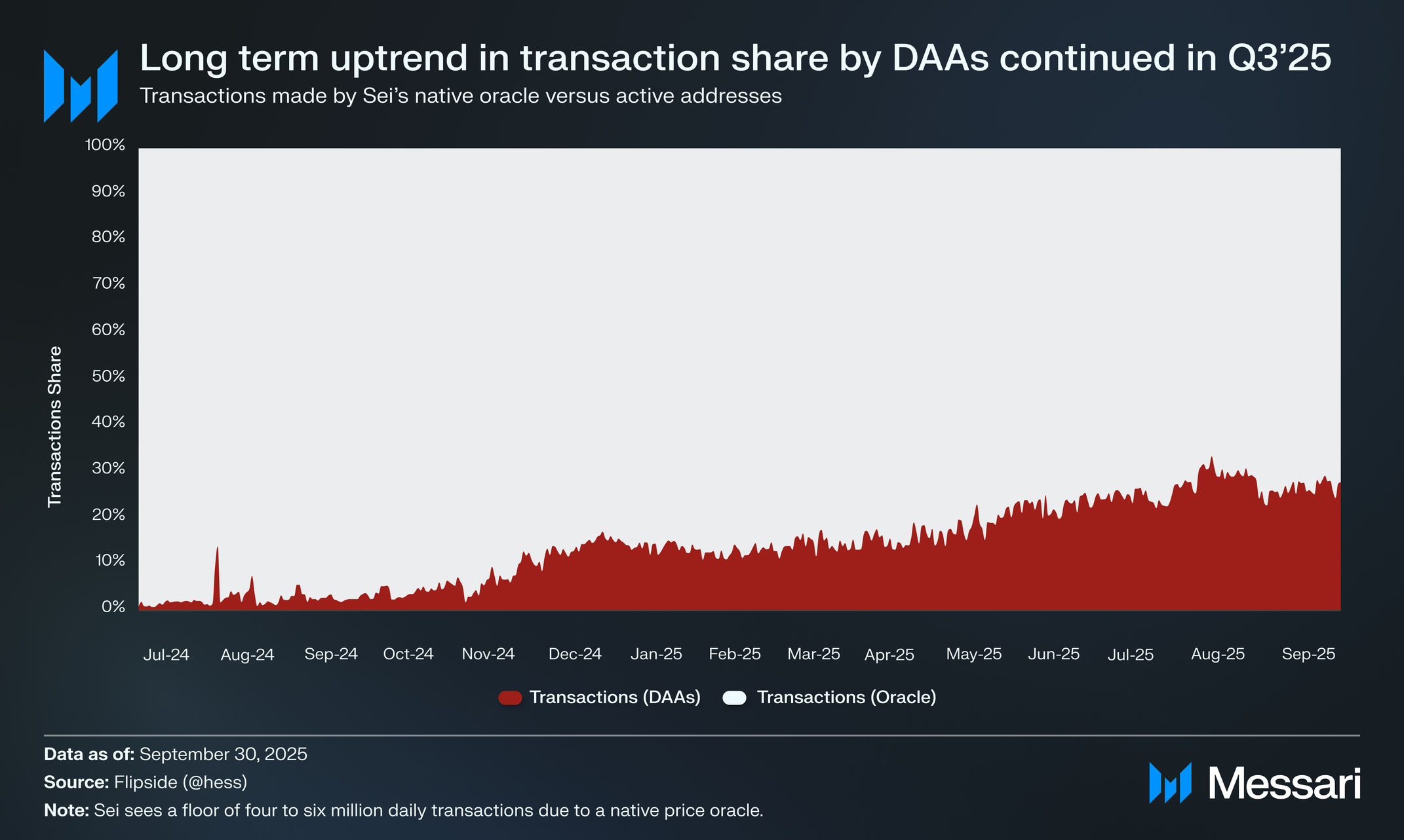 주목할 만하게, 세이는 네이티브 가격 오라클로 인해 일일 400만~600만 거래 건수의 하한선을 보인다. 모든 검증자는 투표 거래를 전송하고 매번 다른 블록마다 업데이트된 가격 데이터를 제공함으로써 오라클로 참여해야 한다. 이러한 거래를 필터링하면 활성 주소에 의한 거래만 남게 되며, 이는 시간 경과에 따른 네트워크 사용 추세를 더 잘 나타낸다.