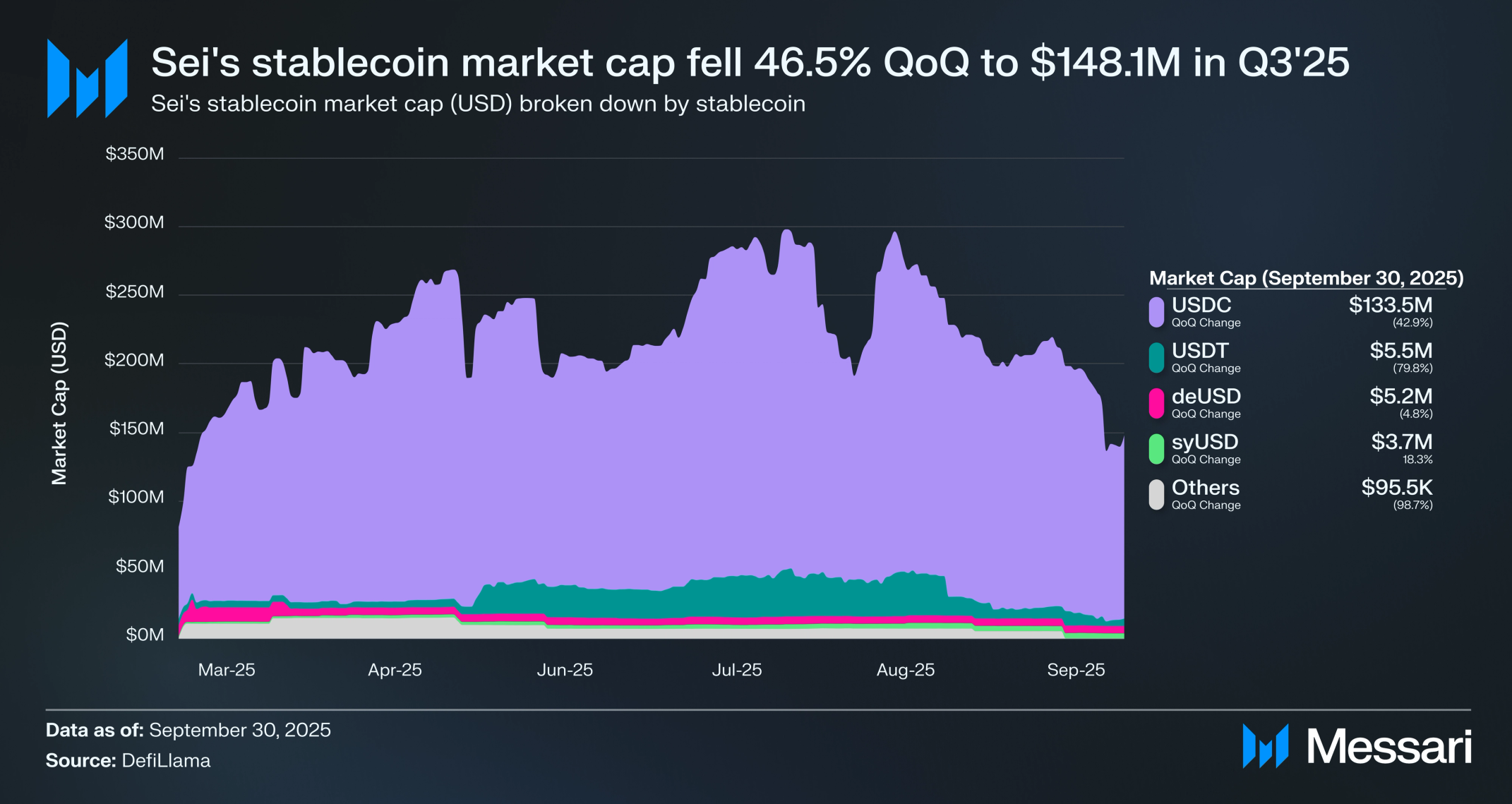 세이의 스테이블코인 시가총액(USD)은 2025년 3분기 말까지 전분기 대비 46.5% 감소한 1억 4,810만 달러를 기록했으며, 2025년 7월 17일의 사상 최고치인 2억 9,790만 달러 대비 50.3% 감소했다. 서클(Circle)은 2025년 7월 세이에서 USDC의 네이티브 발행 및 소각, 크로스체인 전송 프로토콜(CCTP, Cross-Chain Transfer Protocol) 호환성에 대한 지원을 출시했다. USDC는 1억 3,350만 달러로 세이 전체 스테이블코인의 90.2%를 차지하지만, 공급은 전분기 대비 42.9% 감소했다. 테더(Tether)의 USDT는 세이 스테이블코인의 3.7%만 차지하며, 2025년 4월 세이에서 USD₮0 출시 이후 2025년 2분기 강력한 성장에도 불구하고 공급이 전분기 대비 79.8% 감소한 550만 달러를 기록했다.