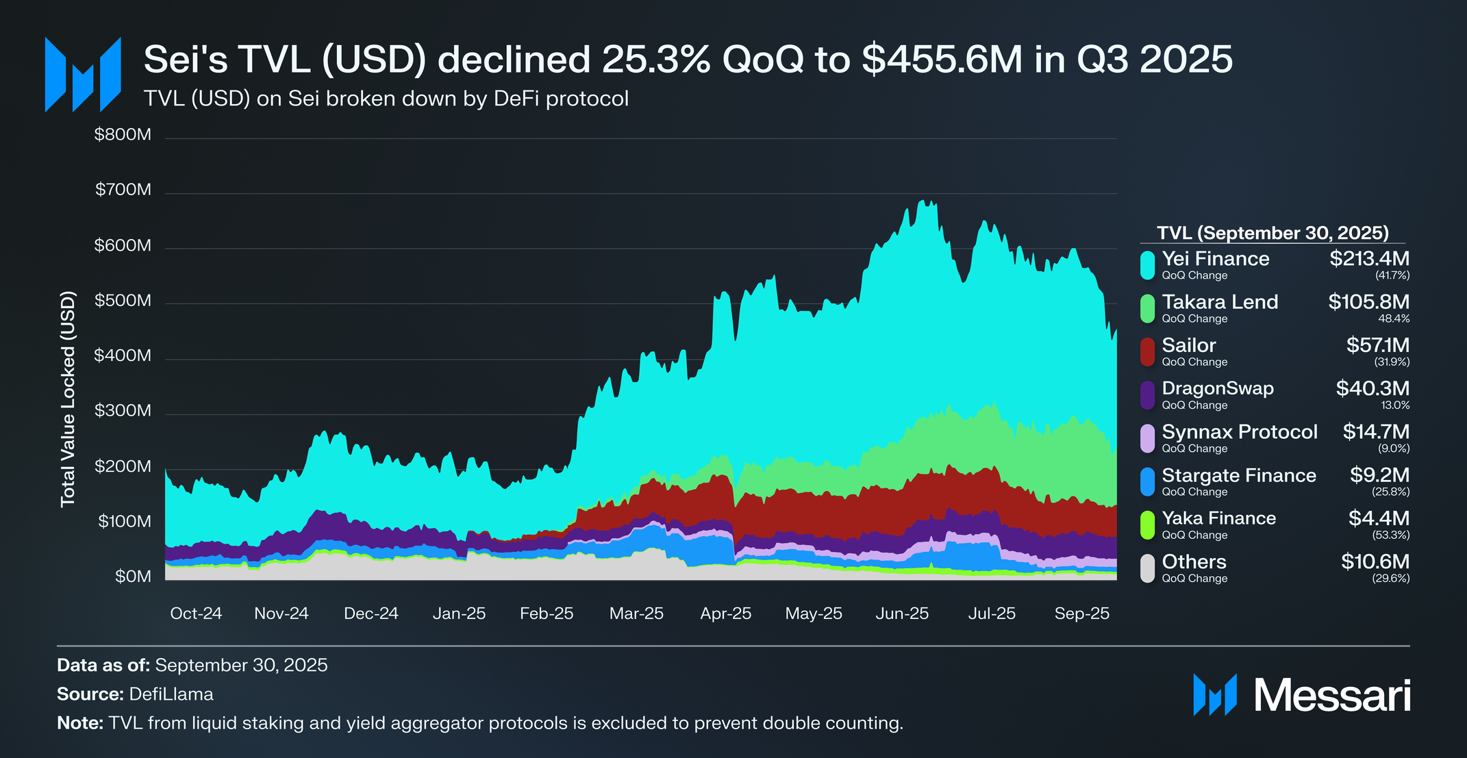 세이의 DeFi 다양성 점수(즉, 네트워크 TVL의 90%를 구성하는 프로토콜 수)는 2025년 2분기에 6개에서 4개로 처음으로 축소되었지만, 2025년 3분기에는 4개를 유지했다. 세이의 상위 DeFi 프로토콜은 계속 공고화되고 있으며, 예이 파이낸스, 타카라 렌드, 세일러(Sailor), 드래곤스왑(DragonSwap)에 보유된 자산은 상대적으로 안정적인 것으로 입증되고 있다.