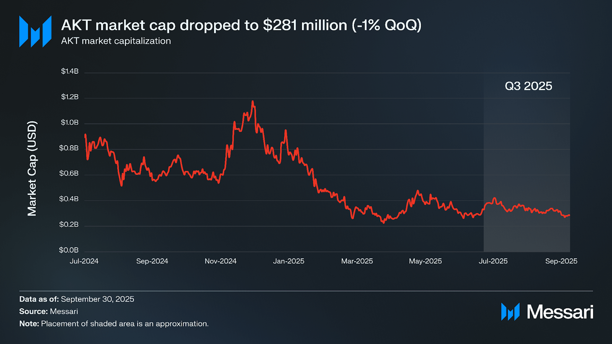아카시의 유통 시가총액은 2025년 3분기 전분기 대비 1.3% 감소하여 2억 8,450만 달러에서 2억 8,080만 달러로 하락했다. AKT 토큰 가격은 같은 기간 동안 3.8% 하락하여 1.05달러에서 1.01달러로 하락했다. 시가총액의 완만한 감소는 유통 공급량의 지속적인 성장과 결합된 토큰 가격의 소폭 움직임을 반영한다. AKT의 소폭 가격 축소는 신규 리스 반등 및 안정적인 GPU 사용량을 포함한 안정적인 네트워크 펀더멘털에도 불구하고 발생했으며, 스테이킹 참여 감소(전분기 대비 -7.6%)와 분기 동안 DePIN 및 AI 컴퓨팅 자산 전반의 광범위한 냉각 속에서 나타났다.