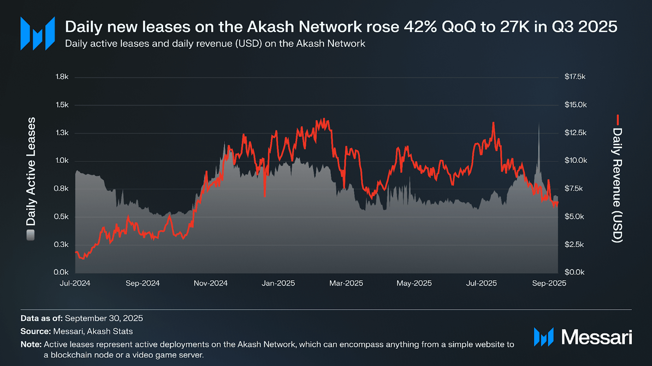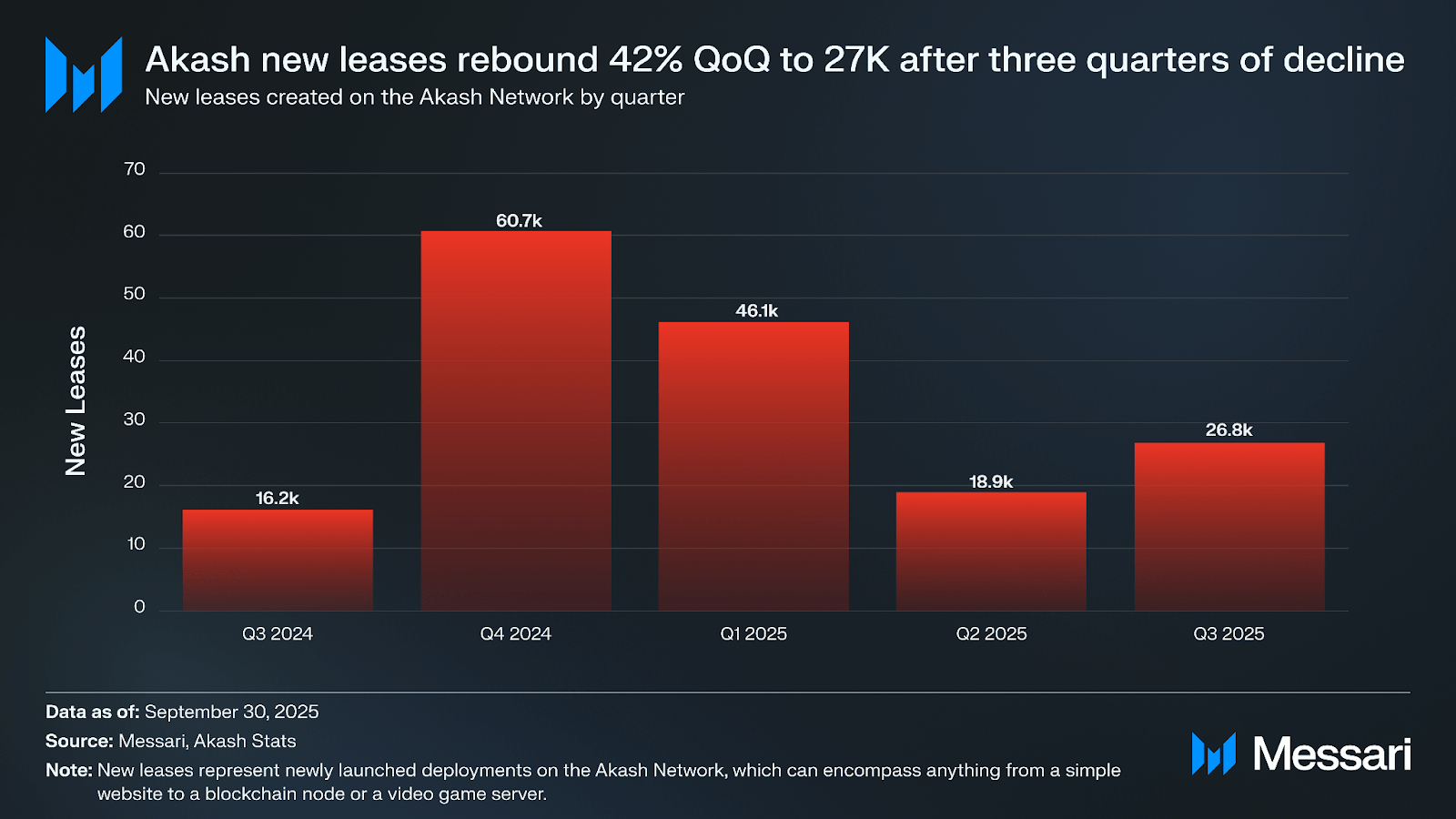 아카시 네트워크의 신규 리스는 사용자와 프로바이더 간의 컴퓨팅 리소스 임대 계약을 나타낸다. 신규 리스는 전분기 대비 42% 증가하여 2025년 2분기 1만 9천 건에서 2025년 3분기 2만 7천 건으로 상승했으며, 2분기 연속 감소 후 반등을 기록했다.