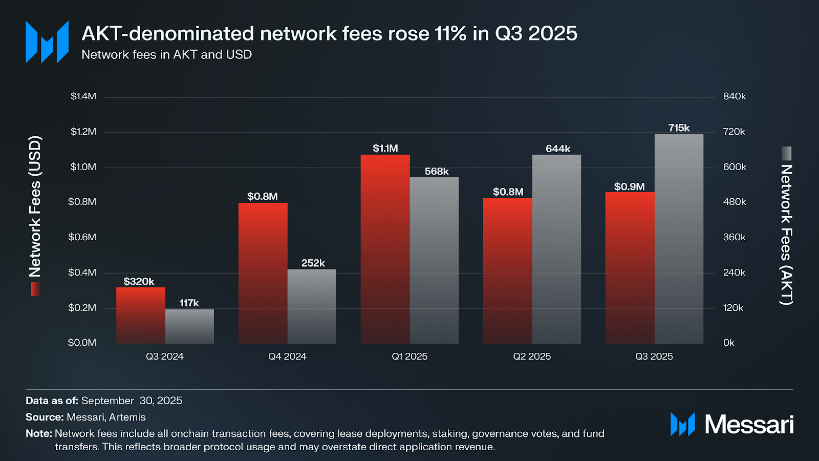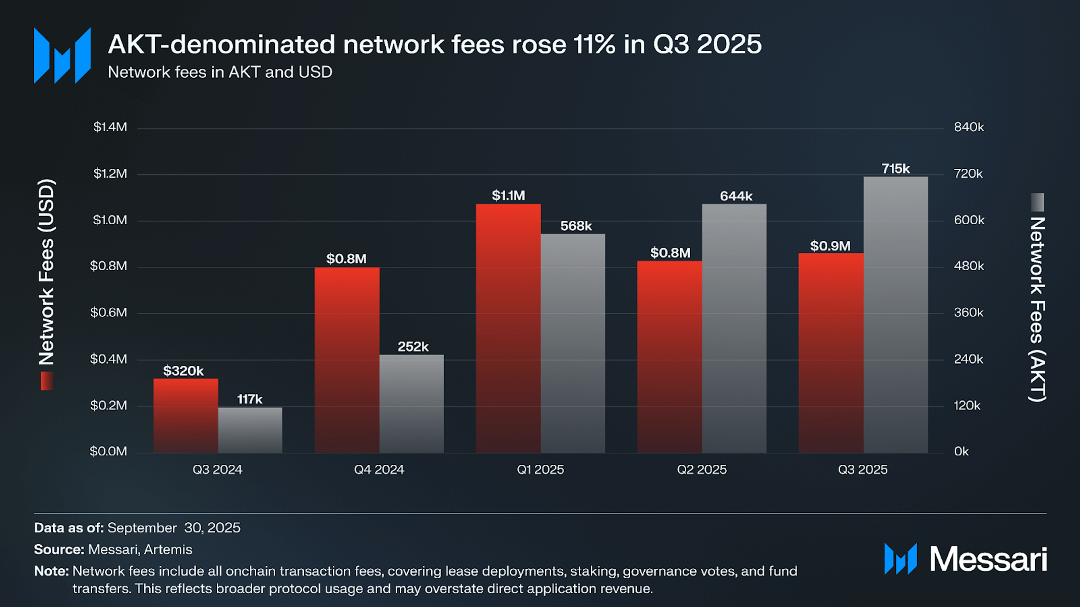 기본 수수료, 프로바이더 수수료율 및 기타 거래 수준 비용을 포함하는 네트워크 거래 수수료 수익은 AKT 기준으로 전분기 대비 11% 증가하여 2025년 2분기 64만 4천 AKT에서 2025년 3분기 71만 5천 AKT로 상승했다. 하지만 달러 기준으로 측정하면 네트워크 수수료 수익은 전분기 대비 4%만 증가하여 82만 7천 달러에서 86만 달러로 상승했다. AKT 표시 성장률과 달러 표시 성장률 간의 격차는 분기 동안 AKT 가격이 4% 하락(1.05달러에서 1.01달러)한 것으로 설명되며, 이는 더 높은 AKT 표시 수수료 물량을 부분적으로 상쇄했다.