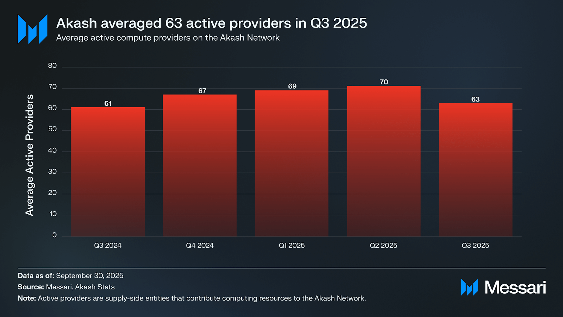 활성 프로바이더는 2025년 3분기 70에서 63으로 감소하여 전분기 대비 11% 감소했으며, 다수 분기 연속 성장 후 첫 축소를 기록했다. 이러한 후퇴는 여러 중복되는 역학을 반영한다. 소규모 운영자들은 GPU 가격이 강화되면서 네트워크에서 이탈했고, 프로바이더들은 스타클러스터의 향후 프로토콜 소유 GPU 공급을 대비하여 우선순위를 재조정했으며, 일부 인프라는 네트워크가 메인넷 14(Mainnet 14) 업그레이드를 준비하면서 이탈했다. 이는 더 적지만 GPU에 특화된 프로바이더 세트를 초래했으며, 분기 전반에 걸쳐 관찰된 단기 추론 워크로드로의 광범위한 전환 및 CPU, RAM, 스토리지 용량 감소와 일치한다.