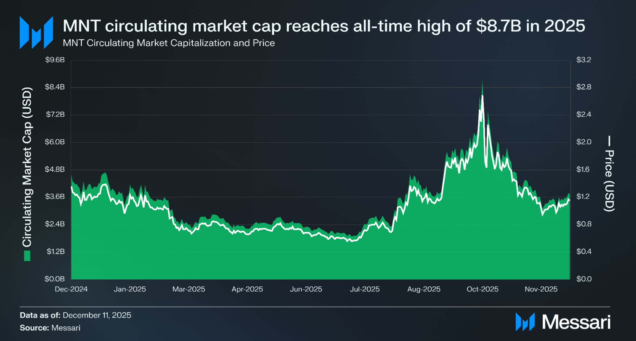 • 거래소 통합 심화로 MNT의 유틸리티와 유통이 강화되었다. 바이비트(Bybit)는 MNT 기반 거래 쌍 확대, 할인된 수수료 지불, 담보 프로그램을 도입했다. 이 기간 동안 MNT의 유통 시가총액은 2025년 10월 8일 약 87억 달러에 도달했다.