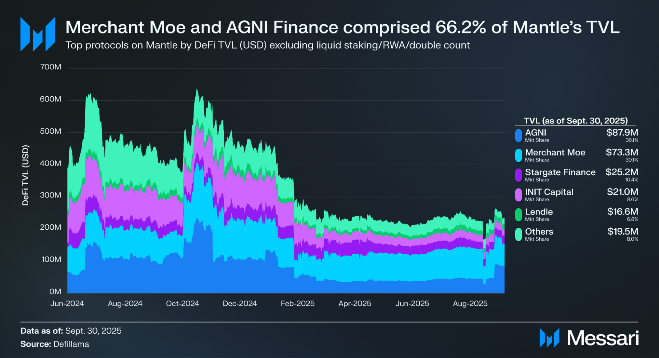 네트워크 전반에서 맨틀의 DeFi TVL은 2025년 9월 30일 기준 2억 4,230만 달러에 도달했다. 머천트 모와 아그니는 함께 전체 TVL의 약 66%를 차지하며, 맨틀의 금융 스택 내 핵심 유동성 허브로서의 위치를 강조한다.