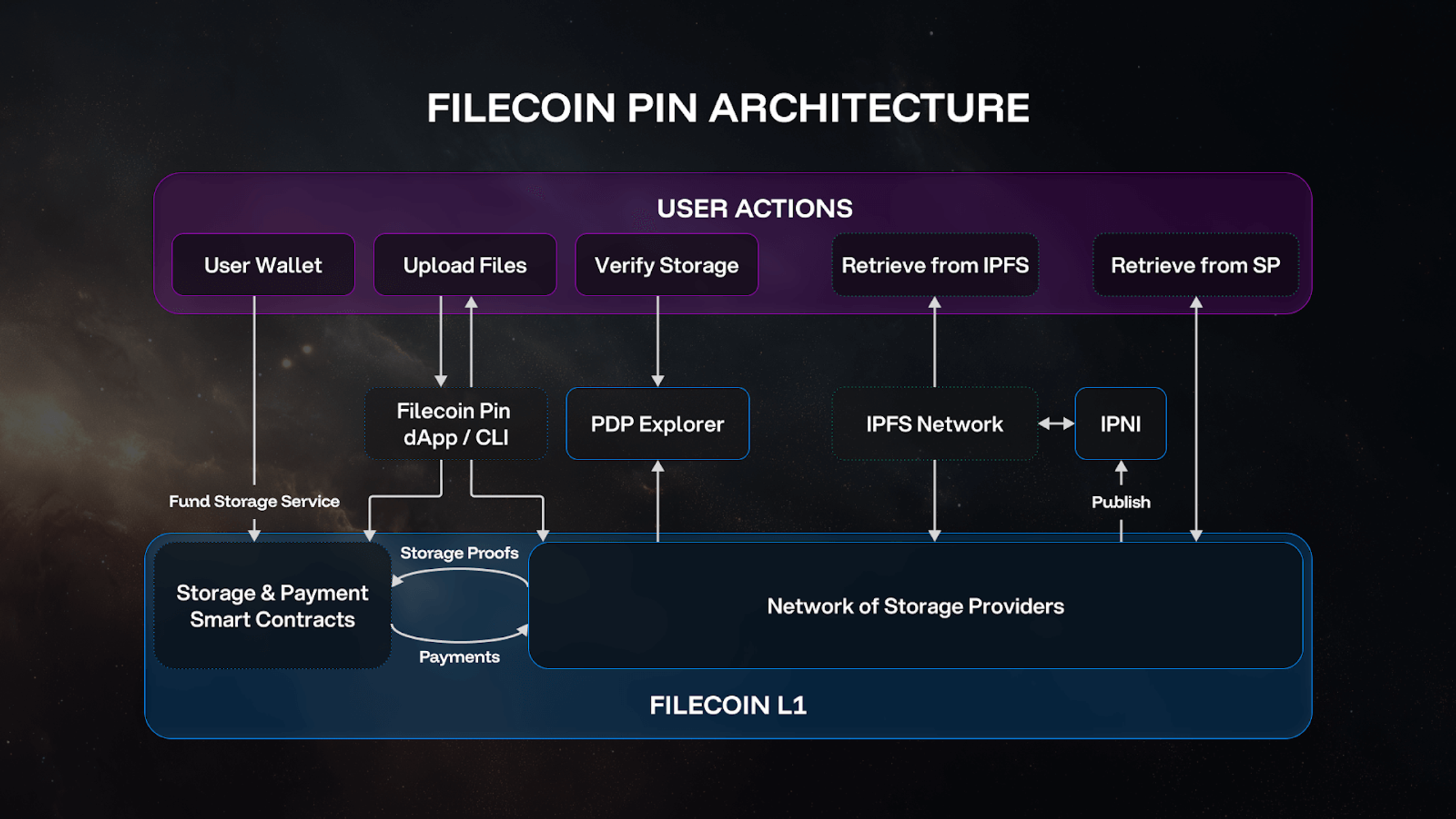 파일코인 핀은 PDP 기반 보장으로 IPFS 콘텐츠를 지속시켜 IPFS와 웜 스토리지를 연결한다. 핀은 콘텐츠 관리를 위한 CLI, GitHub Action, 웹 인터페이스를 제공하여 웹사이트, 메타데이터, 에이전트 파일, 기타 IPFS 자산이 내구성 있고 변조 방지되며 감사 가능한 상태로 유지되도록 보장한다.