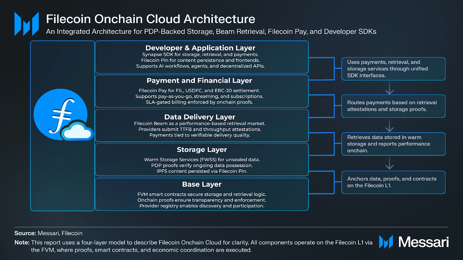 파일코인 온체인 클라우드(FOC)는 파일코인을 프로그래밍 가능하고 검증 가능한 클라우드로 확장하여 이 격차를 해결한다. 플랫폼은 암호화 증명으로 뒷받침되는 웜 스토리지, 성능 기반 인센티브가 있는 검색 시장, 종량제 사용과 자동화된 정산을 지원하는 스마트 컨트랙트 기반 결제 레일을 도입한다. 파일코인 페이, 파일코인 빔(Filecoin Beam), 시냅스 SDK(Synapse SDK), 파일코인 핀(Filecoin Pin)과 같은 개발자 도구는 애플리케이션이 데이터와 결제를 직접 온체인에서 저장, 검색, 조정할 수 있게 한다.