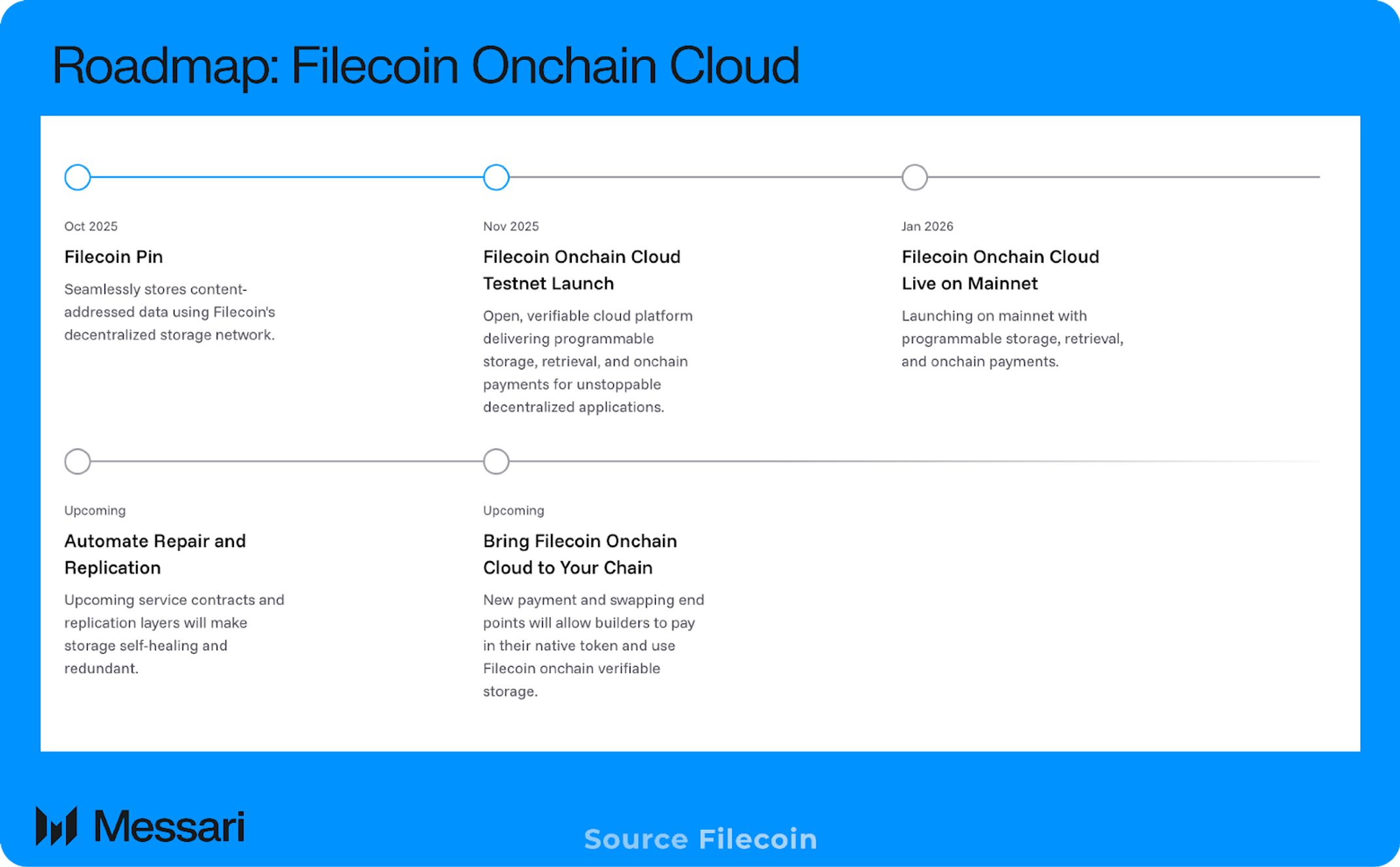 로드맵은 온체인 복제 및 복구, 확장된 SDK 지원, 멀티체인 통합, 초기 검증 가능한 컴퓨트를 목표로 하며, 파일코인을 AI, DePIN, 탈중앙화 애플리케이션을 위한 기초 데이터 및 서비스 레이어로 포지셔닝한다.