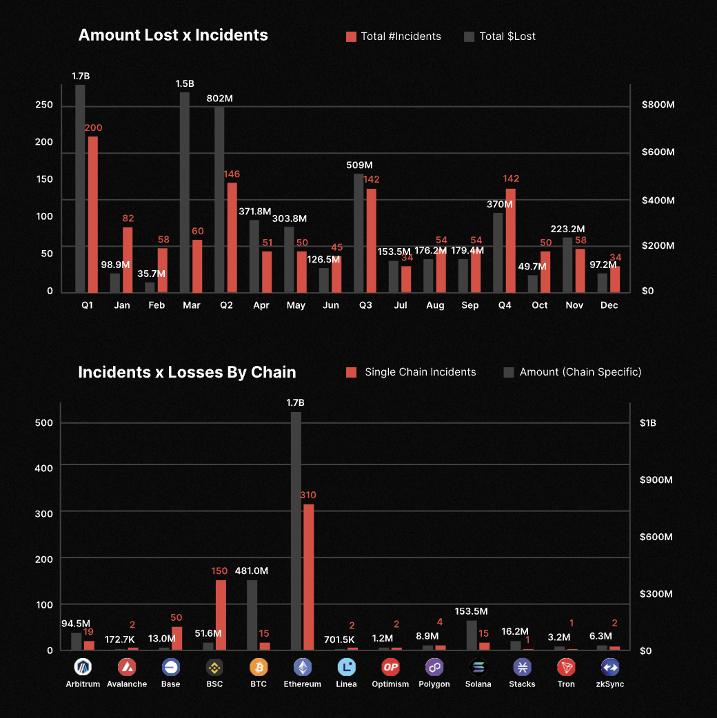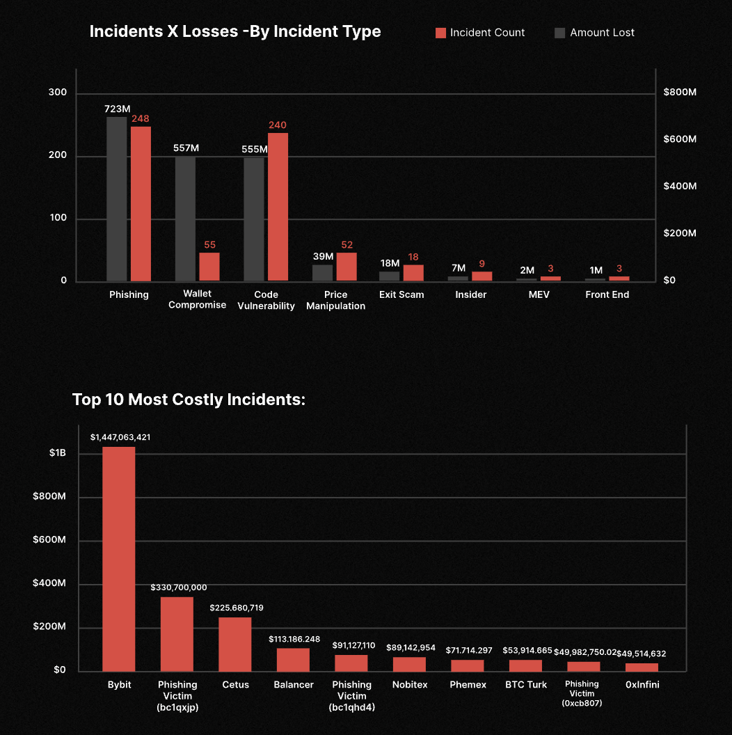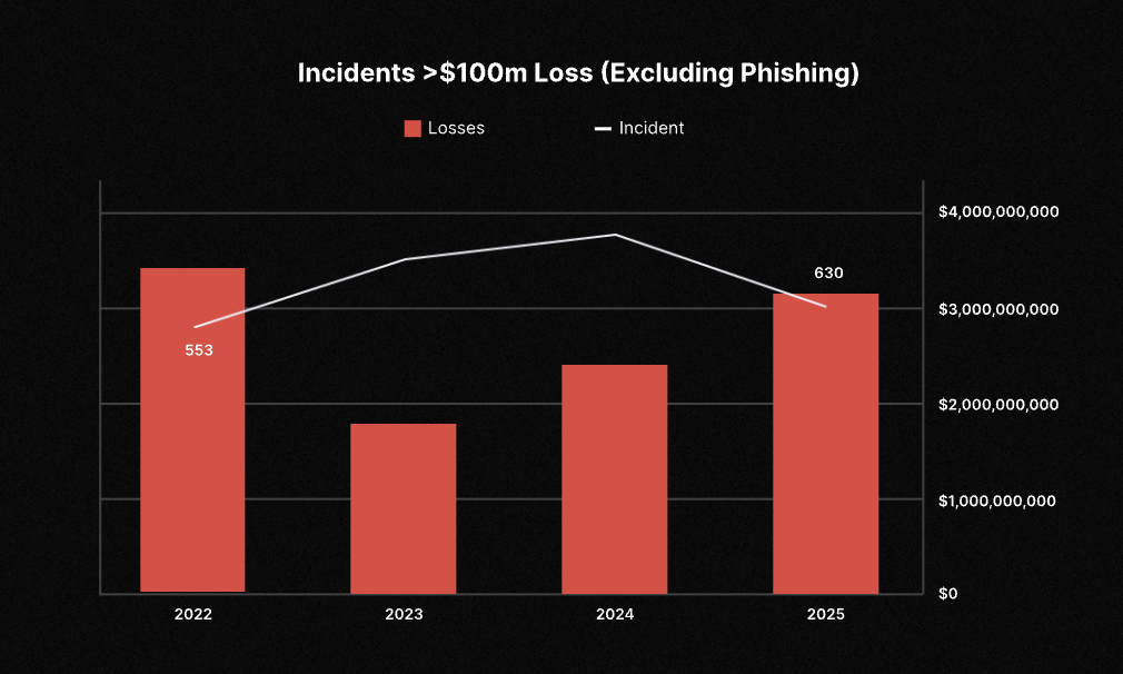- 2025년 한 해 동안 총 630건의 온체인 보안 사고가 발생했으며, 총 피해액은 약 33.53억 달러에 달했습니다.