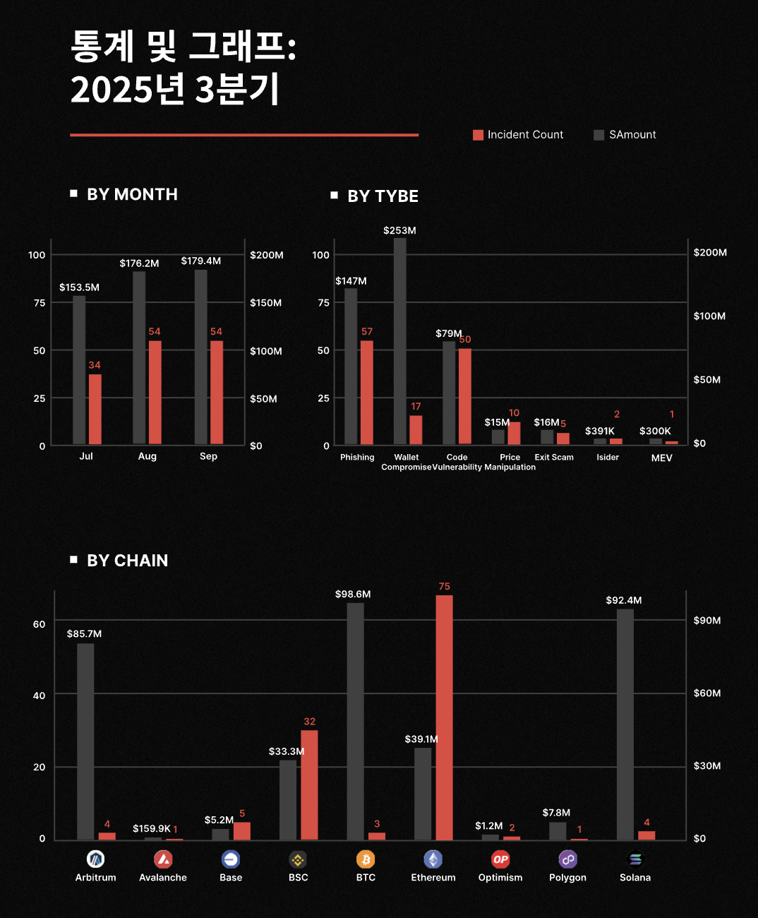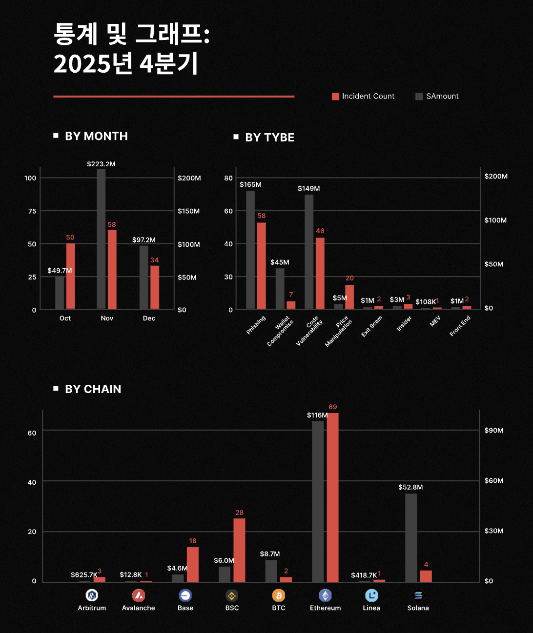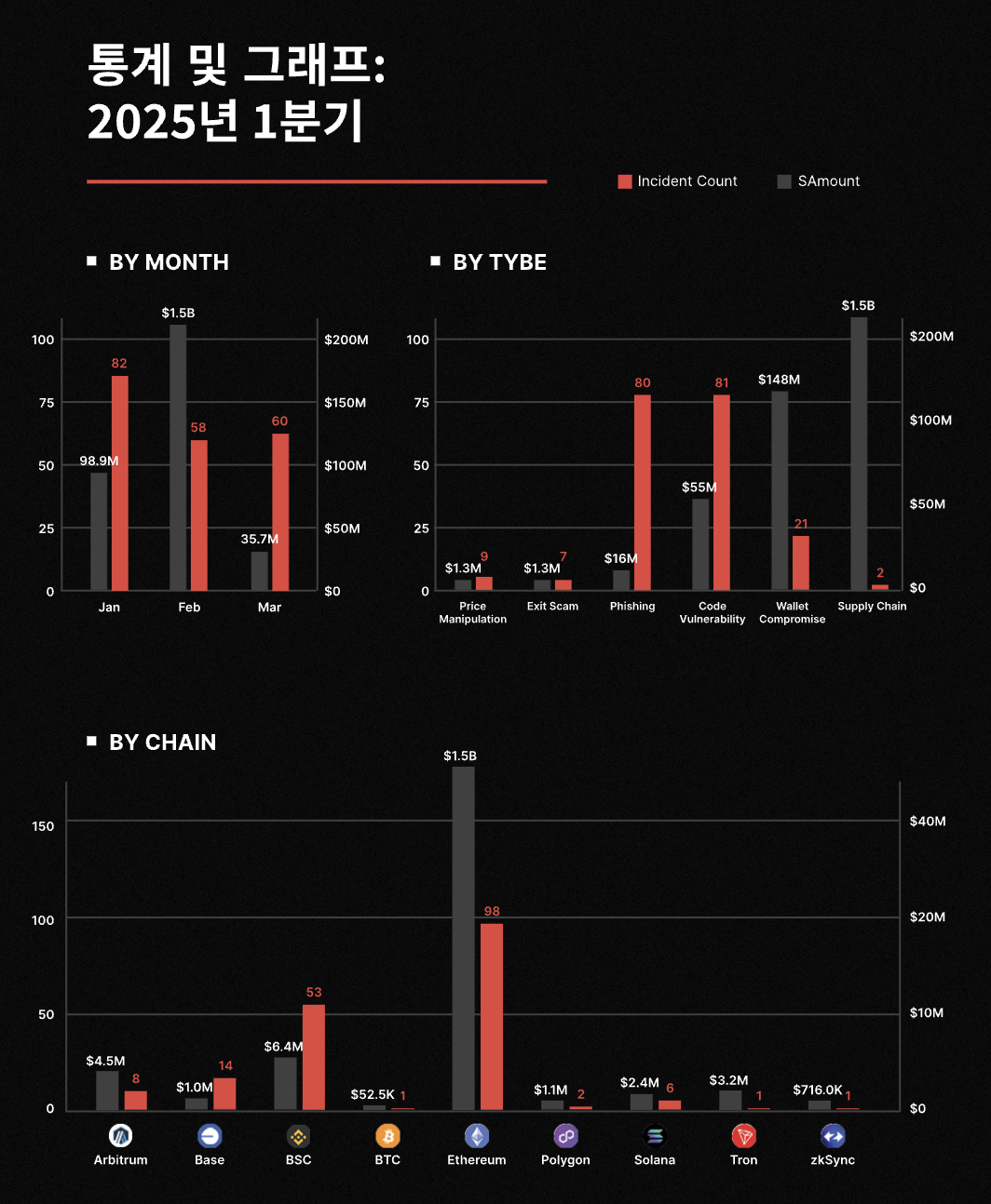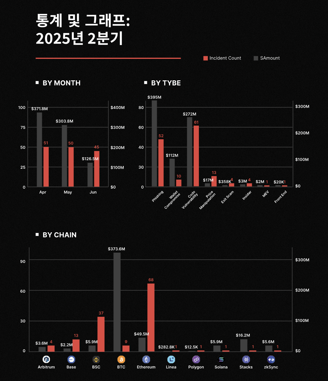 - 2025년 1분기는 해킹·사기·취약점 악용 사건 200건으로 약 16.72억 달러의 피해가 발생해, 연중 가장 큰 피해를 기록한 분기였습니다. 반면 2분기 피해액은 전 분기 대비 약 52% 감소했습니다.