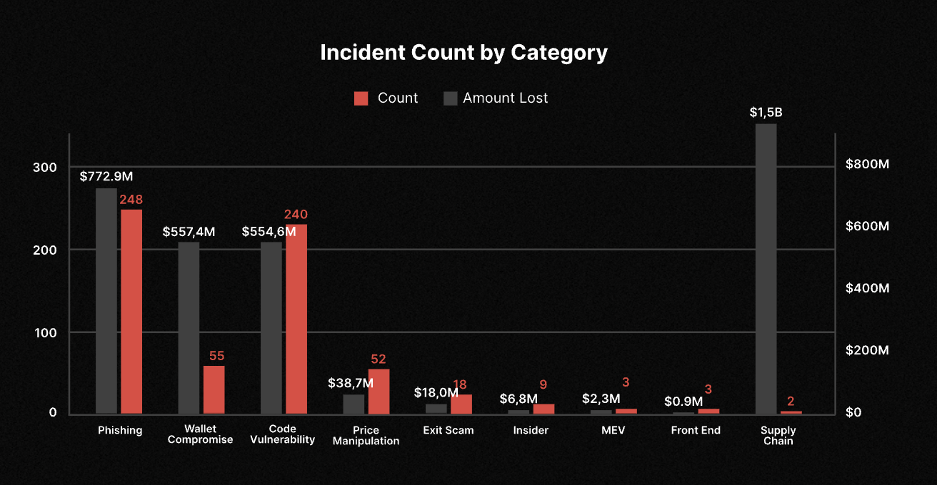 - 피싱 공격은 총 248건으로 2025년 가장 흔한 공격 유형이었으며, 약 7.23억 달러의 피해를 초래했습니다. 이는 코드 취약점 공격(240건)보다 소폭 높은 수치입니다.