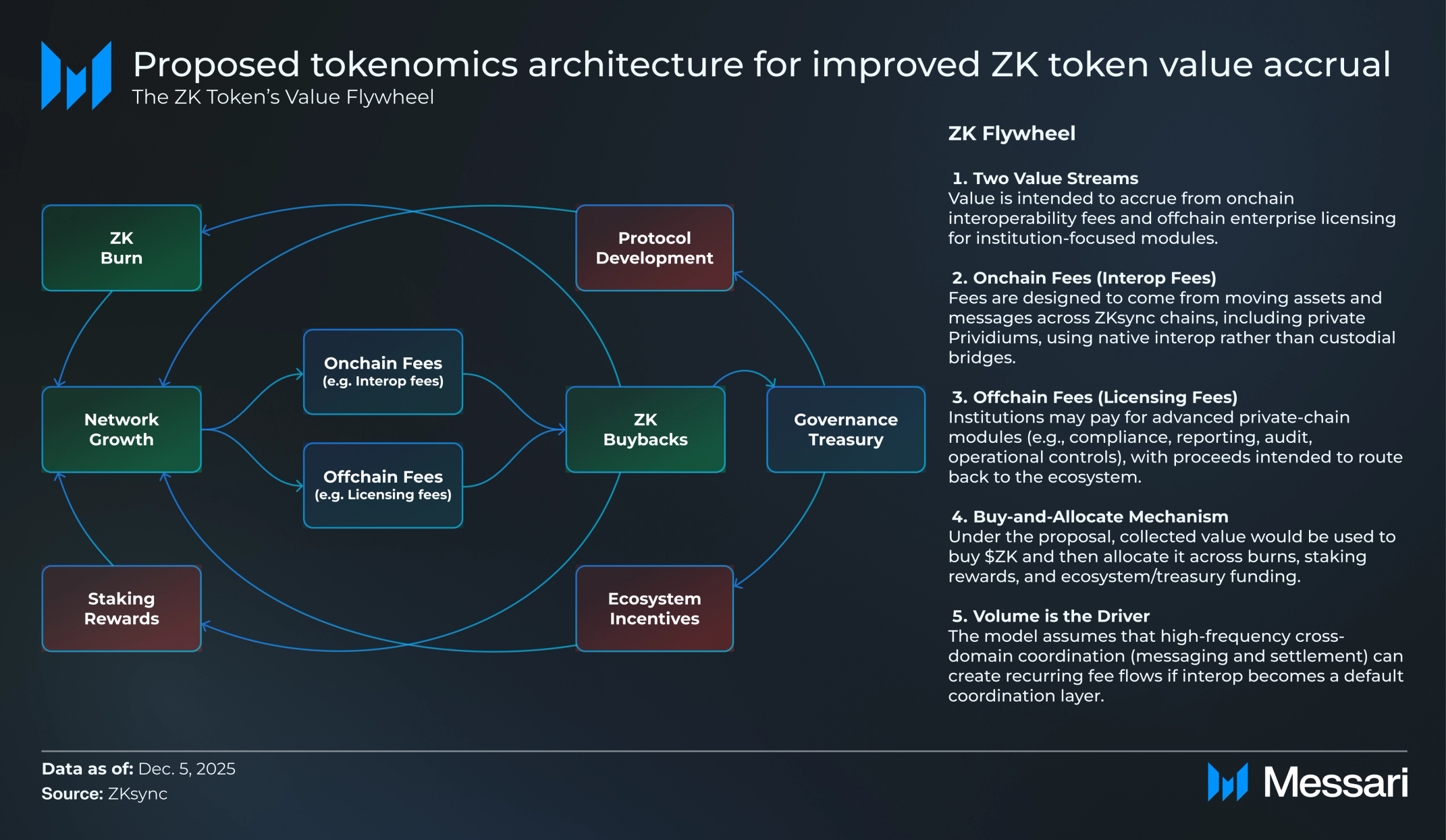 • 토크노믹스에 대한 거버넌스 제안은 ZK 토큰으로 가치를 환원하는 것을 계획한다. 구현될 경우, 수수료 및 라이선싱 수익은 ZK를 소각하고, 스테이킹 보상에 자금을 제공하며, 생태계 지출을 지원할 수 있는 구매 및 할당 메커니즘으로 유입된다.