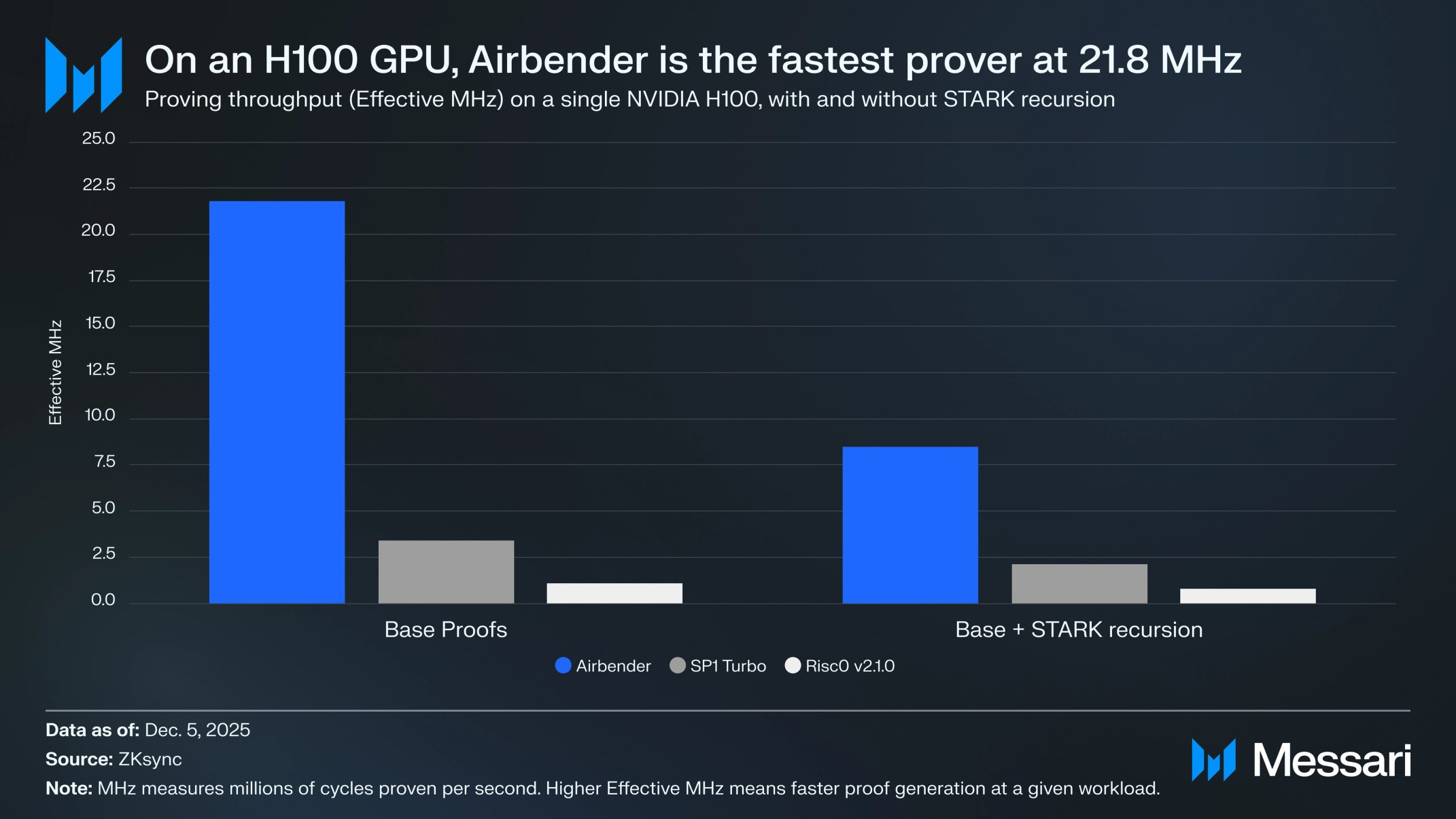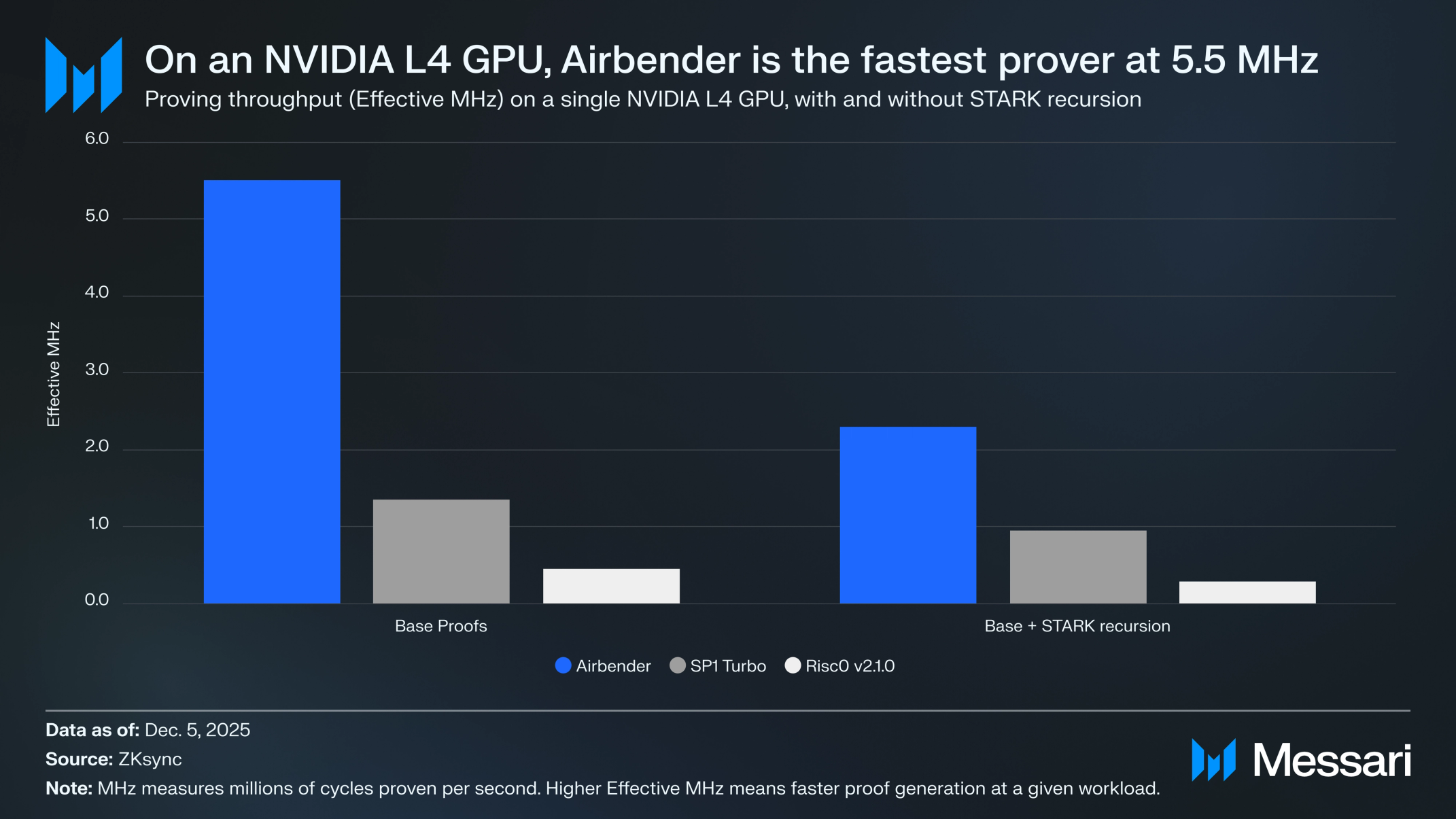 벤치마크 결과는 에어벤더가 기본 증명 및 재귀 증명 모두에서 다른 오픈소스 zkVM을 능가함을 보여준다. 보고된 측정에는 H100 GPU에서의 강력한 기본 증명 처리량과 더 작은 L4 GPU에서의 지속적인 성능 우위가 포함되며, 엔드투엔드 증명 이득이 재귀 하에서도 지속된다. 동일한 벤치마크에서 더 빠른 증명은 전송당 약 0.0001 달러의 증명 비용 및 일반적인 ZK싱크 워크로드에 대한 1초 미만의 블록 증명과 연관된다.