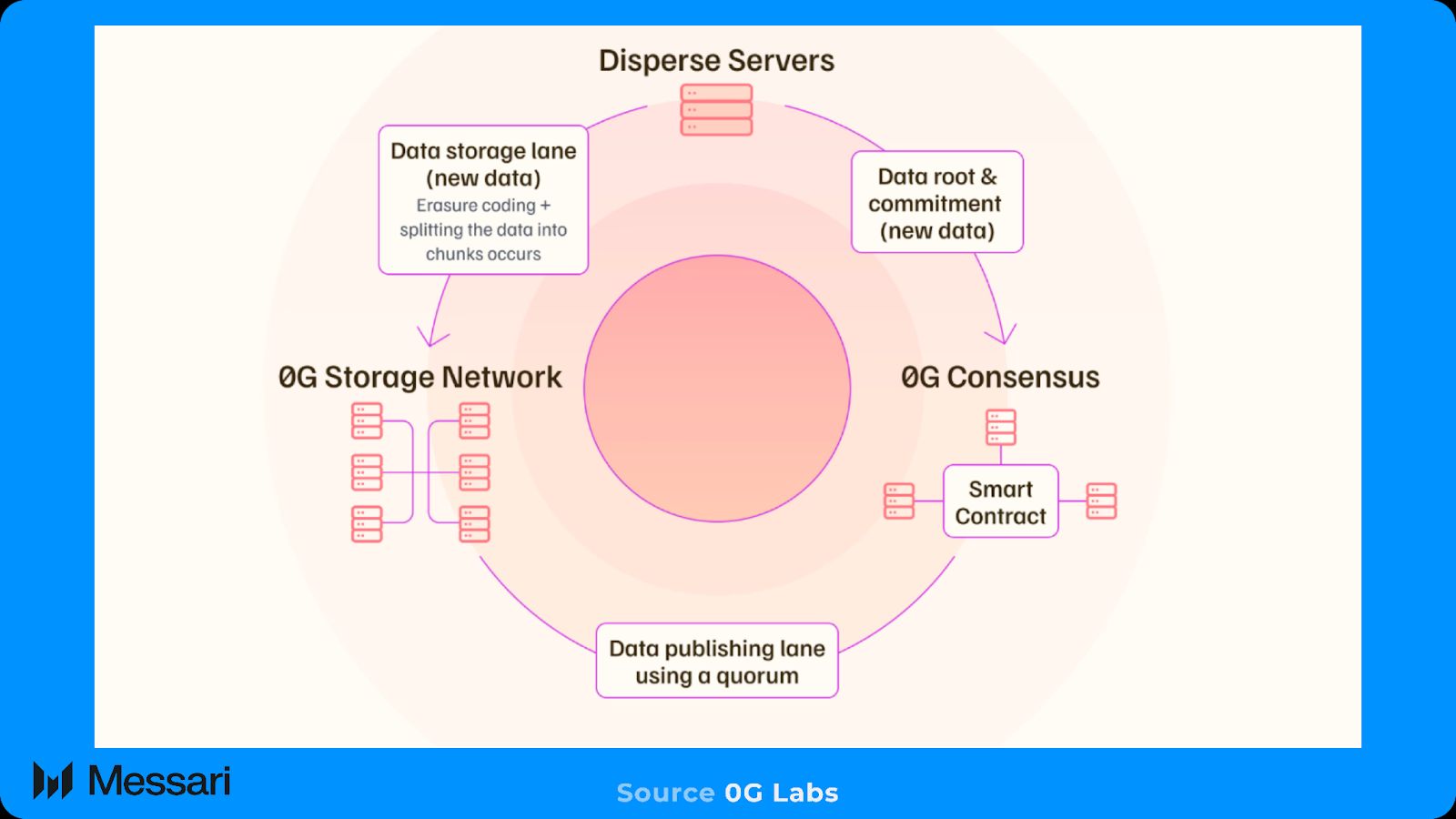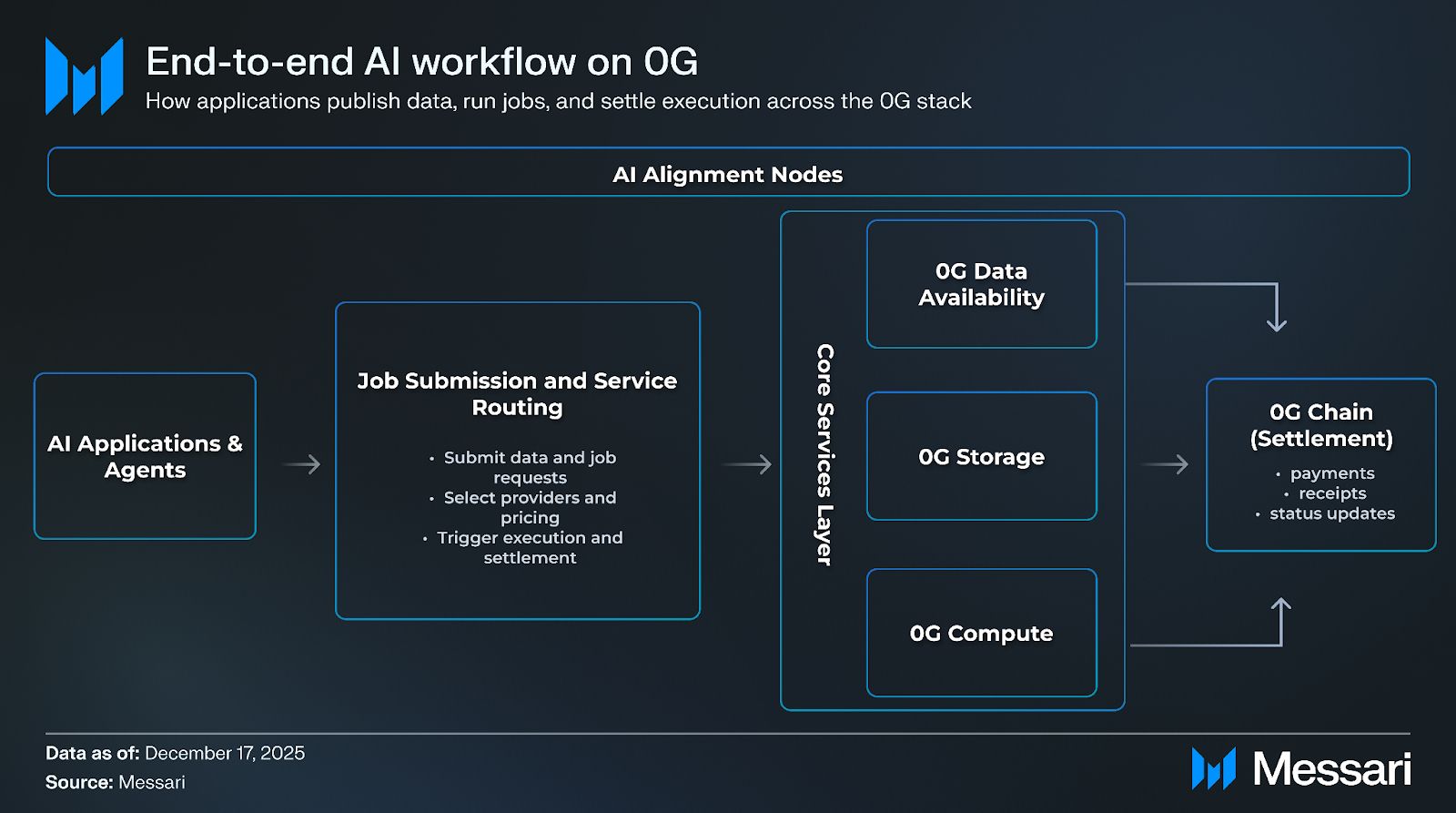0G는 정산을 위한 EVM 체인, 대규모 데이터셋 게시를 위한 DA 계층, 데이터 검색을 위한 스토리지 네트워크, 추론 및 미세 조정을 촉진하는 컴퓨트 네트워크를 포함하여 AI 작업 부하를 위한 수직 통합 인프라 스택이다. 네트워크의 목표는 데이터 게시, 스토리지, 컴퓨트가 각각 자체 토큰, 수수료, 실패 모드를 갖는 분산된 파이프라인을 피하는 것이다.