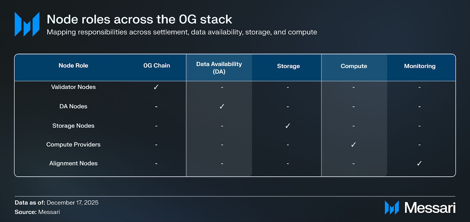 0G는 정산, 데이터 가용성, 스토리지, 컴퓨트가 뚜렷한 운영 요구 사항을 갖는 모듈형 스택을 실행한다. 결과적으로 참여는 단일 노드 유형이 아니라 전문화된 노드 역할에 걸쳐 분할된다.