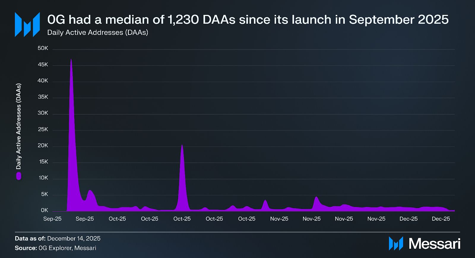 0G는 스테이킹, 위임, 컴퓨트, 스토리지, DA 서비스의 정기적인 사용 전반에 걸쳐 적극적인 참여를 생성하는 것을 목표로 한다. 공급 측면을 성장시키기 위해 핵심 팀은 테스트넷 검증자가 메인넷으로 전환하는 것을 지원하고, 관리형 액세스를 통해 제공자를 추가하며, 라이선스 프로그램을 통해 얼라인먼트 노드 참여를 확대했다. 수요 측면을 성장시키기 위해 0G는 토큰 보유자를 스테이커, 위임자, 작업 제출자로 전환하려고 시도하고, SDK로 파트너 앱을 지원하며, 일회성 캠페인이 아닌 반복되는 작업 부하를 대상으로 하는 인센티브에 커뮤니티 및 생태계 할당을 활용하고 있다. 메인넷 출시 이후 0G는 2025년 12월 14일 기준 일일 활성 주소 중앙값이 1,230개로 핵심 거래자 기반을 유지했다.
