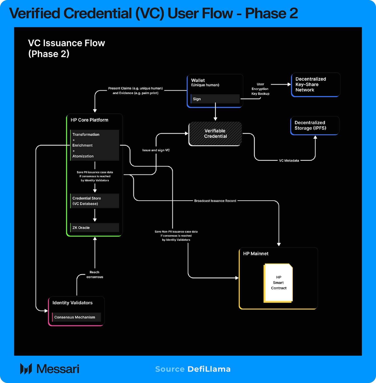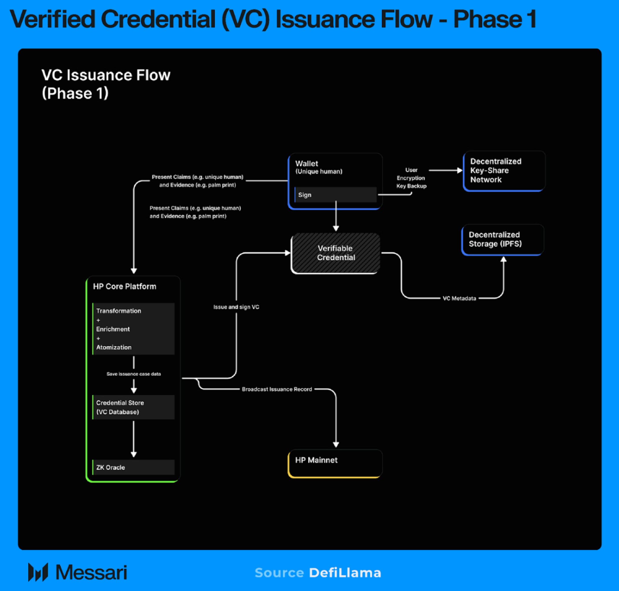 1단계에서 검증 가능한 자격증명은 휴머니티 프로토콜 핵심 플랫폼에 의해 직접 발급되고 서명된다. 사용자는 클레임(예: "고유한 인간")과 생체인식 증거(예: 손바닥 스캔)를 제시한다. 핵심 플랫폼은 이 데이터를 변환하고 자격증명 데이터베이스에 발급 기록을 저장하며 검증 가능한 자격증명을 사용자의 지갑에 발급한다. 자격증명 메타데이터는 탈중앙화 스토리지(IPFS) 및 탈중앙화 키 공유 네트워크를 통해 백업되지만 이 단계에서 신뢰 앵커는 핵심 플랫폼 자체로 남아 있다. 검증은 증명 생성을 위한 zk 오라클에 의존하지만 외부 검증자의 합의는 아직 흐름의 일부가 아니다.