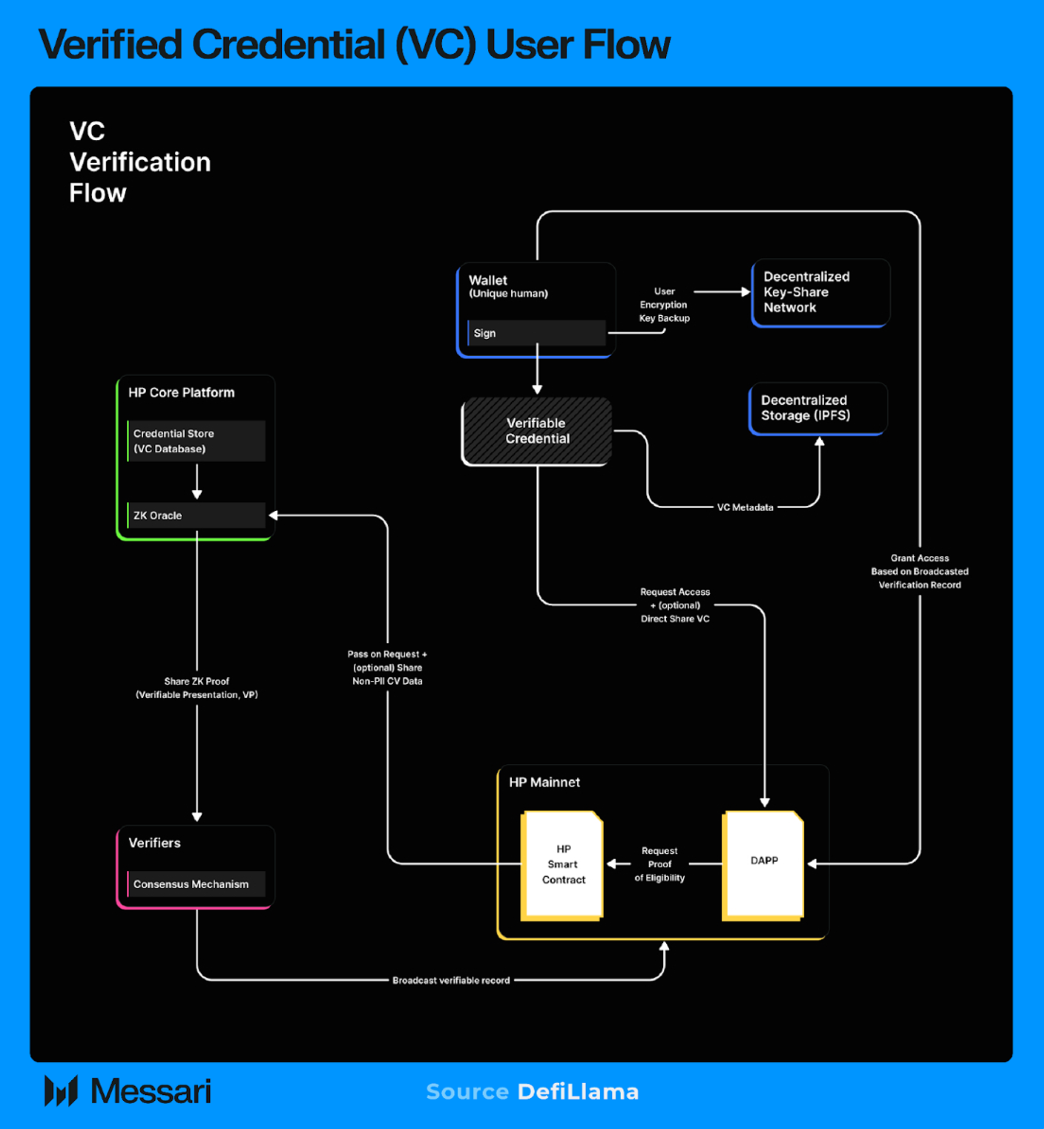휴머니티 프로토콜은 검증된 사용자가 초기 등록 후 검증된 자격증명(VC)을 생성하고 제시할 수 있도록 함으로써 신뢰 증명을 온체인 신원 검증 시스템으로 확장한다. 기본 데이터를 노출하지 않고 이러한 암호화 증명은 나이, 거주지 또는 이벤트 접근과 같은 특정 특성을 확인한다. 자격증명은 양도 불가능하며 단일 휴먼 ID에 바인딩되어 위임이나 재판매를 방지한다.
