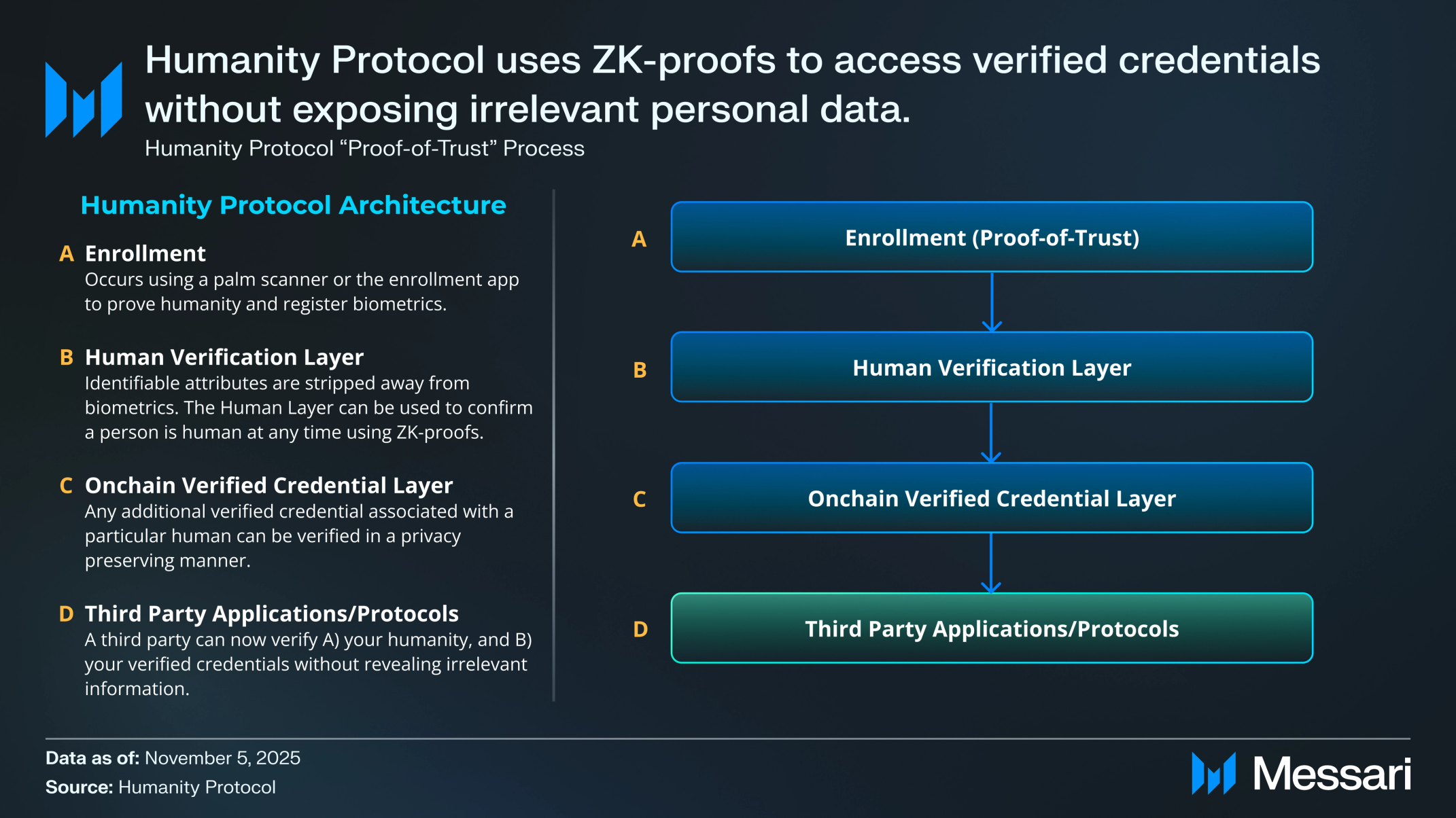 휴머니티 프로토콜은 온체인에서 고유성, 신원 및 개인 속성을 검증하는 탈중앙화 신뢰 아키텍처를 제안한다. 손바닥 생체인식은 각 참여자가 고유하고 살아있는 인간임을 검증하는 데 사용되며, 원시 생체인식 데이터를 저장하거나 노출하지 않는다. 이 위에 영지식 암호화는 휴머니티가 사용자를 대신하여 거의 모든 속성(예: 나이, 거주지 또는 소득 범위)에 대한 프라이버시 보호 자격증명을 발급하고 검증할 수 있게 하며, 이는 프라이버시 보호 방식으로 검증될 수 있다.
