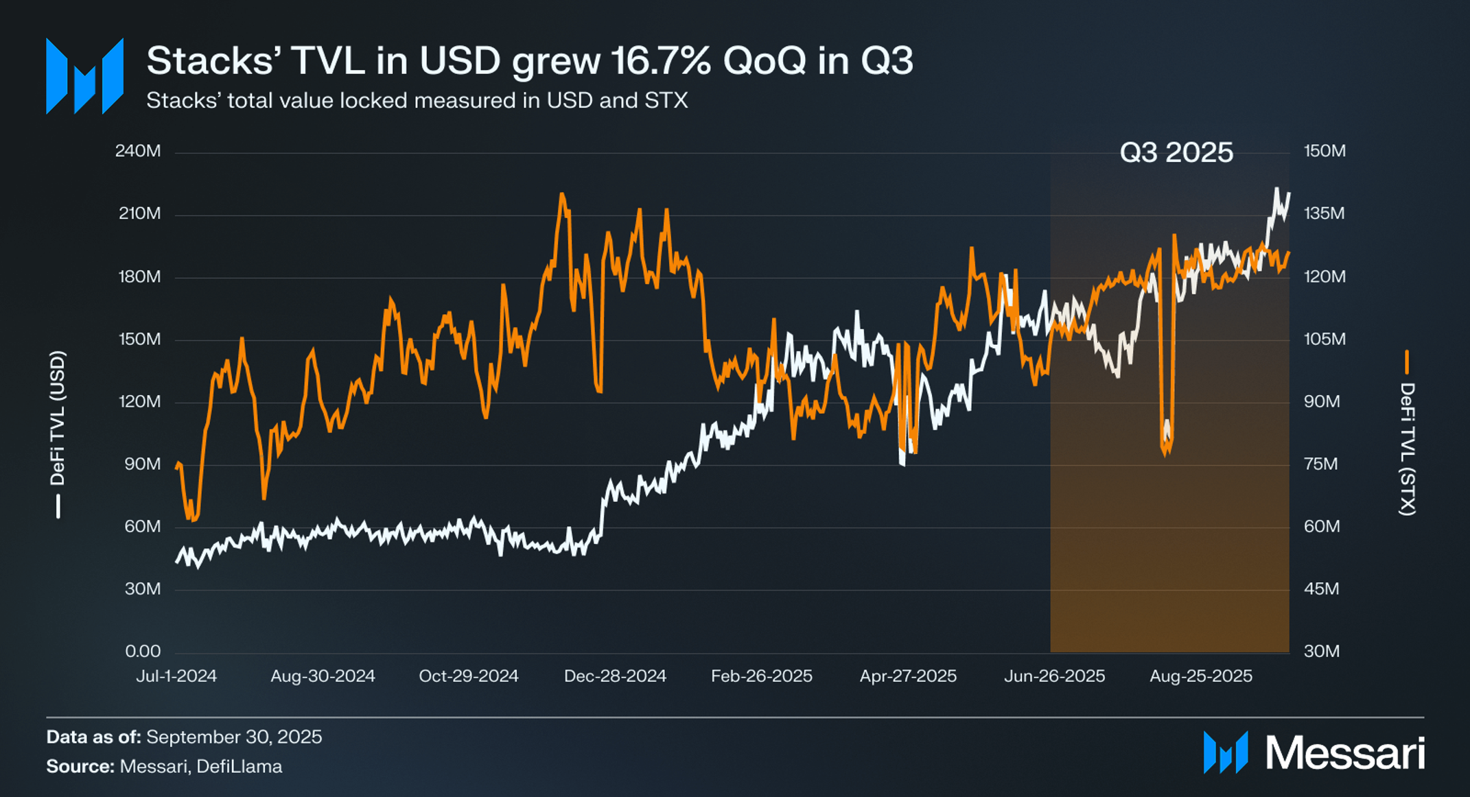 스택스의 총 예치 가치(TVL)는 2025년 3분기에 의미 있는 성장을 기록했다. 달러 기준으로 전분기 대비 16.7% 증가하여 1억 830만 달러에서 1억 2,640만 달러로 상승했으며, 이는 생태계의 새로운 모멘텀을 반영한다. 네이티브 STX 기준으로는 TVL이 전분기 대비 47.1% 증가하여 1억 5,030만 STX에서 2억 2,110만 STX로 늘어났다. 두 지표 모두에서의 이러한 상당한 상승은 연중 회복과 추가 제품 채택에 따라 스택스의 비트코인 DeFi에 대한 자본 참여가 강화되고 있음을 나타낸다.