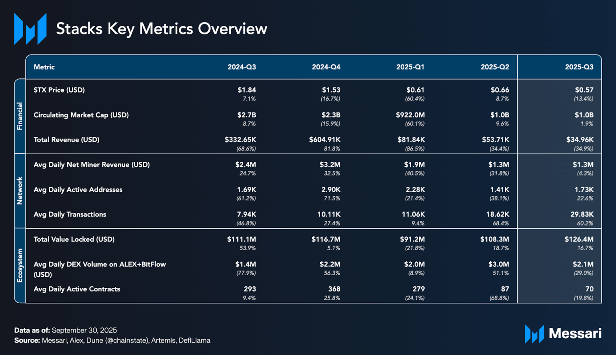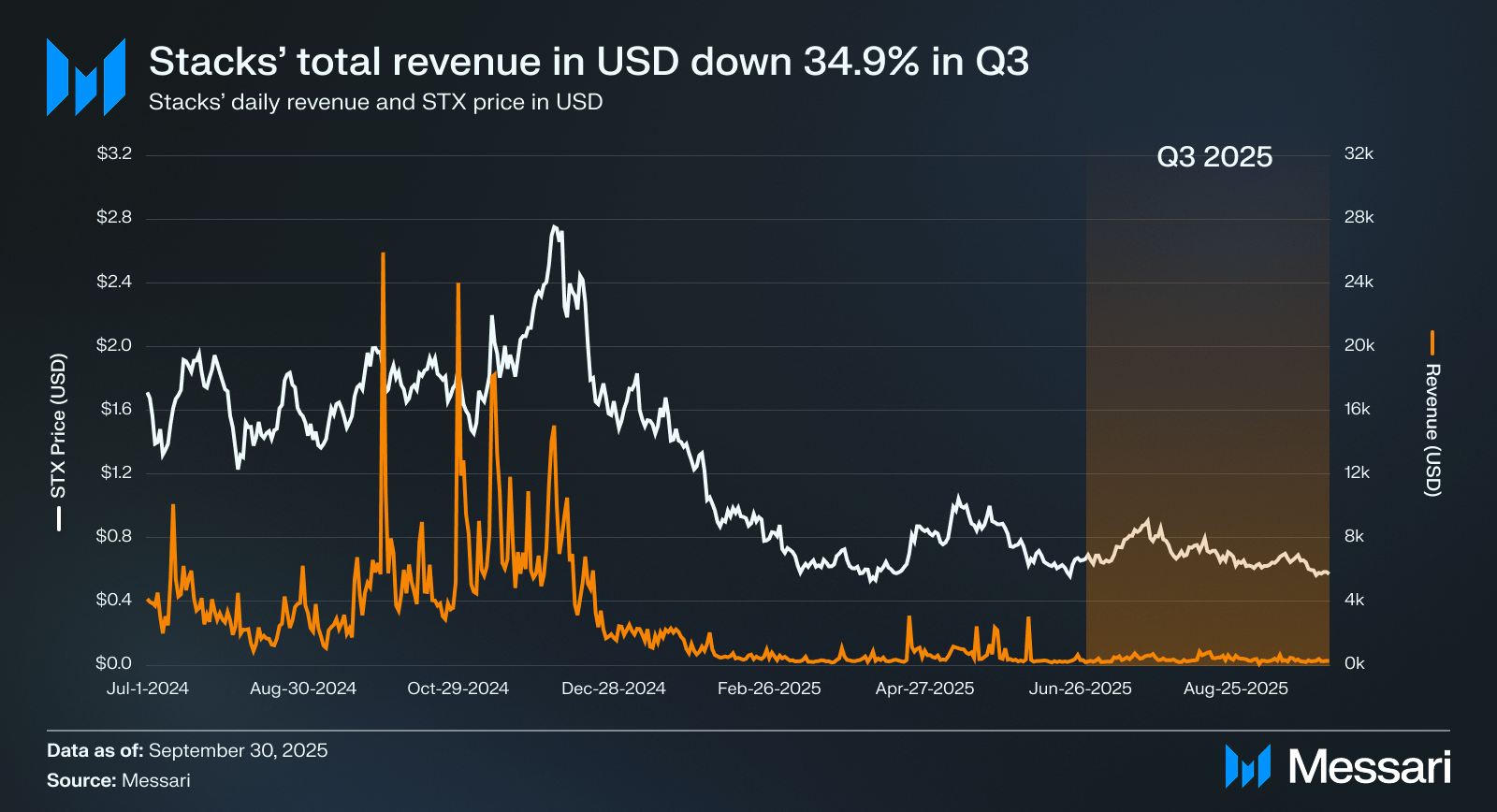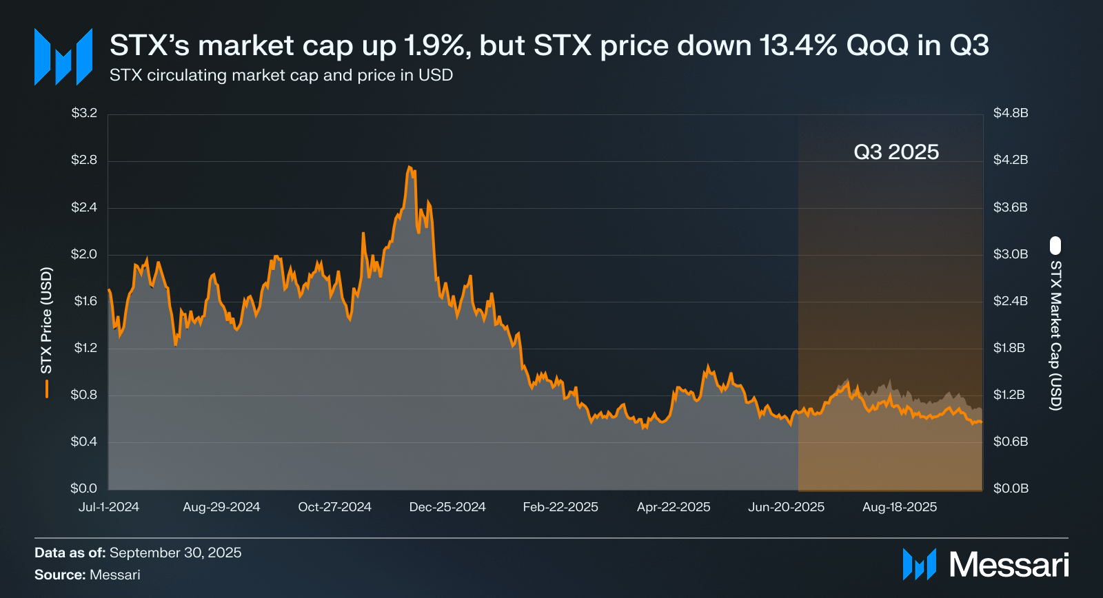 BTC와 ETH 시가총액이 각각 전분기 대비 6.6%, 66.7% 상승한 것에 비해 스택스의 시가총액은 전분기 대비 1.9% 증가하여 2025년 3분기에 10억 3천만 달러를 기록했다. 이는 2분기의 10억 1천만 달러에서 증가한 수치이다. 절대적 수치로는 명목상 증가했지만, STX 가격은 전분기 대비 13.4% 하락하여 0.66 달러에서 0.57 달러가 되었다.