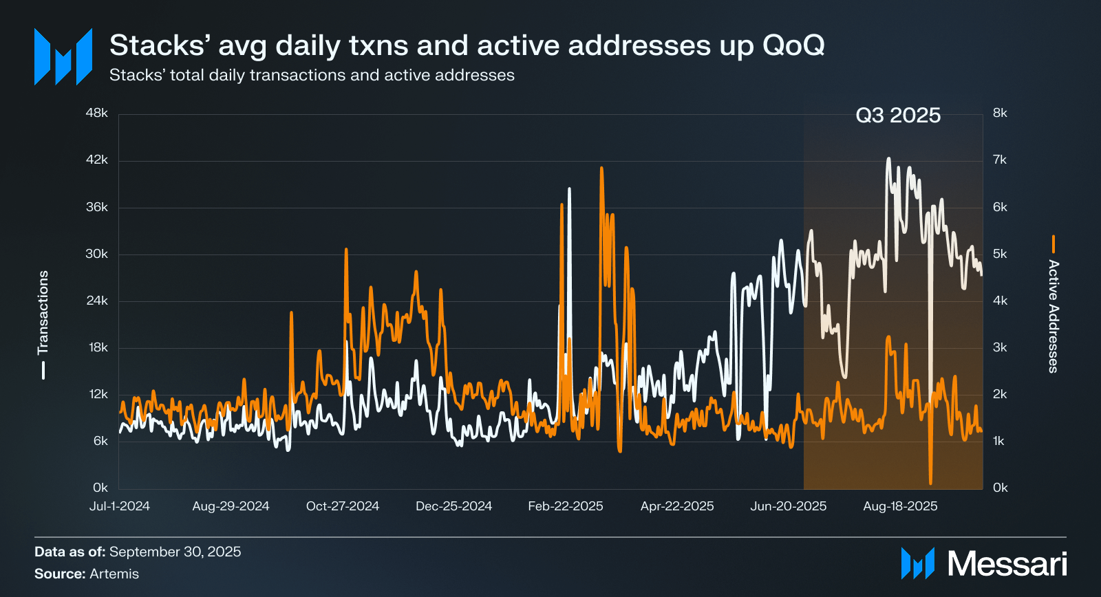 2025년 3분기에 광범위한 암호화폐 시장은 소폭 상승하여 BTC와 ETH 시가총액이 각각 전분기 대비 6.6%, 66.7% 증가했다. 이에 비해 스택스(STX)는 달러 기준으로 비교적 평탄한 상태를 유지했으며, 유통 시가총액은 전분기 대비 1.9% 증가하여 10억 3천만 달러가 되었지만, STX 가격은 13.4% 하락하여 0.57 달러가 되었다. 이전 분기와 달리 핵심 사용 지표가 반등했다. 평균 일일 거래 건수는 전분기 대비 60.2% 증가하여 29,828건이 되었고, 총 거래 건수는 61.9% 증가하여 270만 건이 되었으며, 평균 일일 활성 주소는 22.6% 증가하여 1,731개가 되었다. 이러한 증가는 스테이블코인 통합과 광범위한 DeFi 성장에 따른 온체인 활동의 회복을 반영한다.