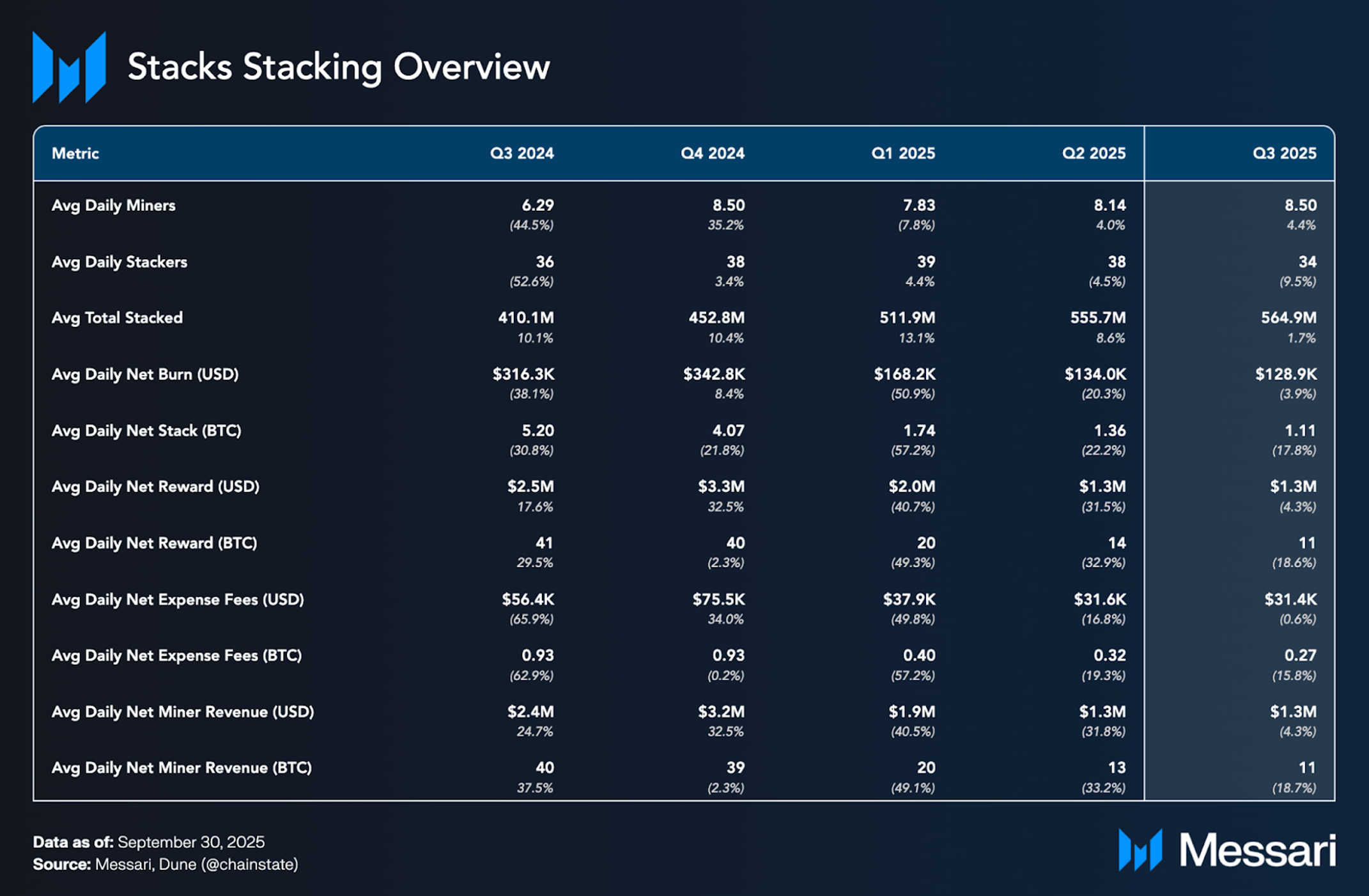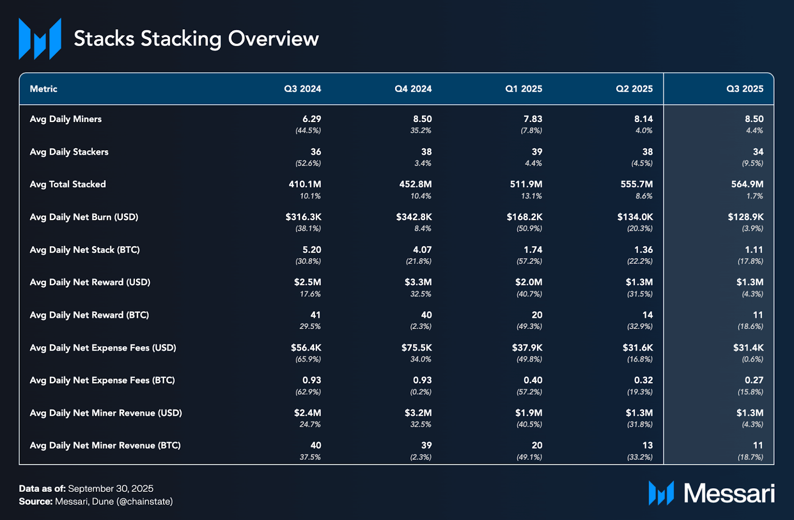 스태킹 인센티브는 3분기에도 계속 악화되어 거시적 상황과 토큰 역학에서 비롯된 지속적인 역풍을 반영했다. 3분기의 평균 일일 순 소각은 달러 기준으로 전분기 대비 3.9% 감소하여 128,858 달러가 되었고, 2024년 4분기 이후 시작된 하락 추세가 지속되었다. 마찬가지로 평균 일일 순 스택은 3분기에 전분기 대비 17.8% 감소하여 1.1 BTC가 되었으며, 이는 5분기 연속 감소이다. 2024년 3분기에 일일 5.2 BTC로 정점을 찍은 이후 순 스택 볼륨은 거의 79% 감소했다. 이러한 하락은 BTC와 STX 가격 간의 지속적인 불일치를 강조하며, BTC 초과 성과가 스택스의 프루프 오브 트랜스퍼(PoX) 사이클 참여의 상대적 매력도를 감소시킨다.