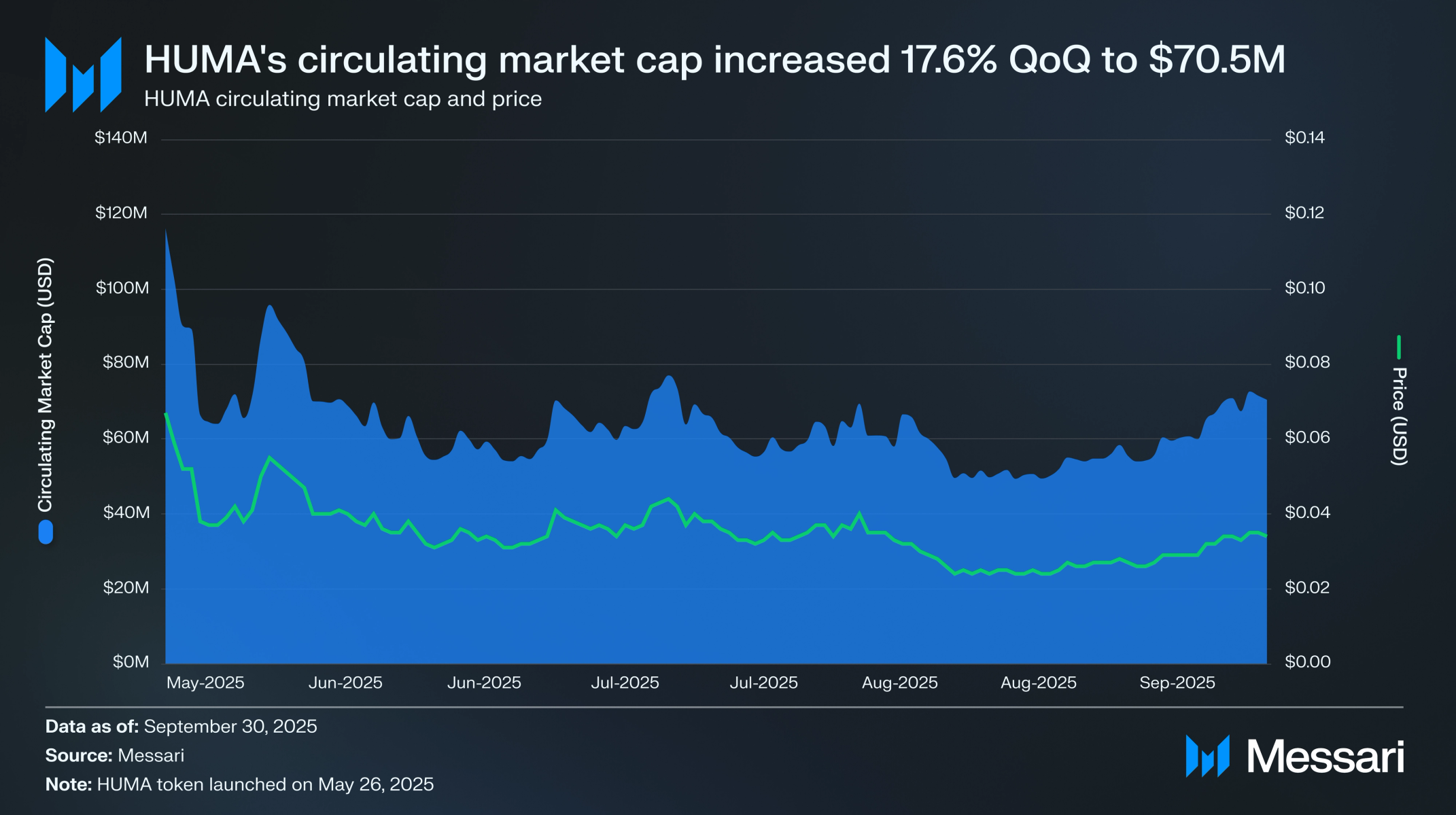 HUMA 토큰의 유통 시가총액은 3분기 동안 3억 3,300만 HUMA 토큰이 잠금 해제되어 6월 30일 5,990만 달러에서 9월 30일 7,050만 달러로 전분기 대비 17.6% 증가했다. HUMA 토큰 가격은 0.035달러에서 0.034달러로 전분기 대비 1.4% 하락했다. HUMA는 여전히 시장 발견 단계 초기에 있기 때문에 유동성이 증가하고 시장 참여자들이 적절한 가치평가를 결정함에 따라 가격 변동성이 일반적으로 나타난다.