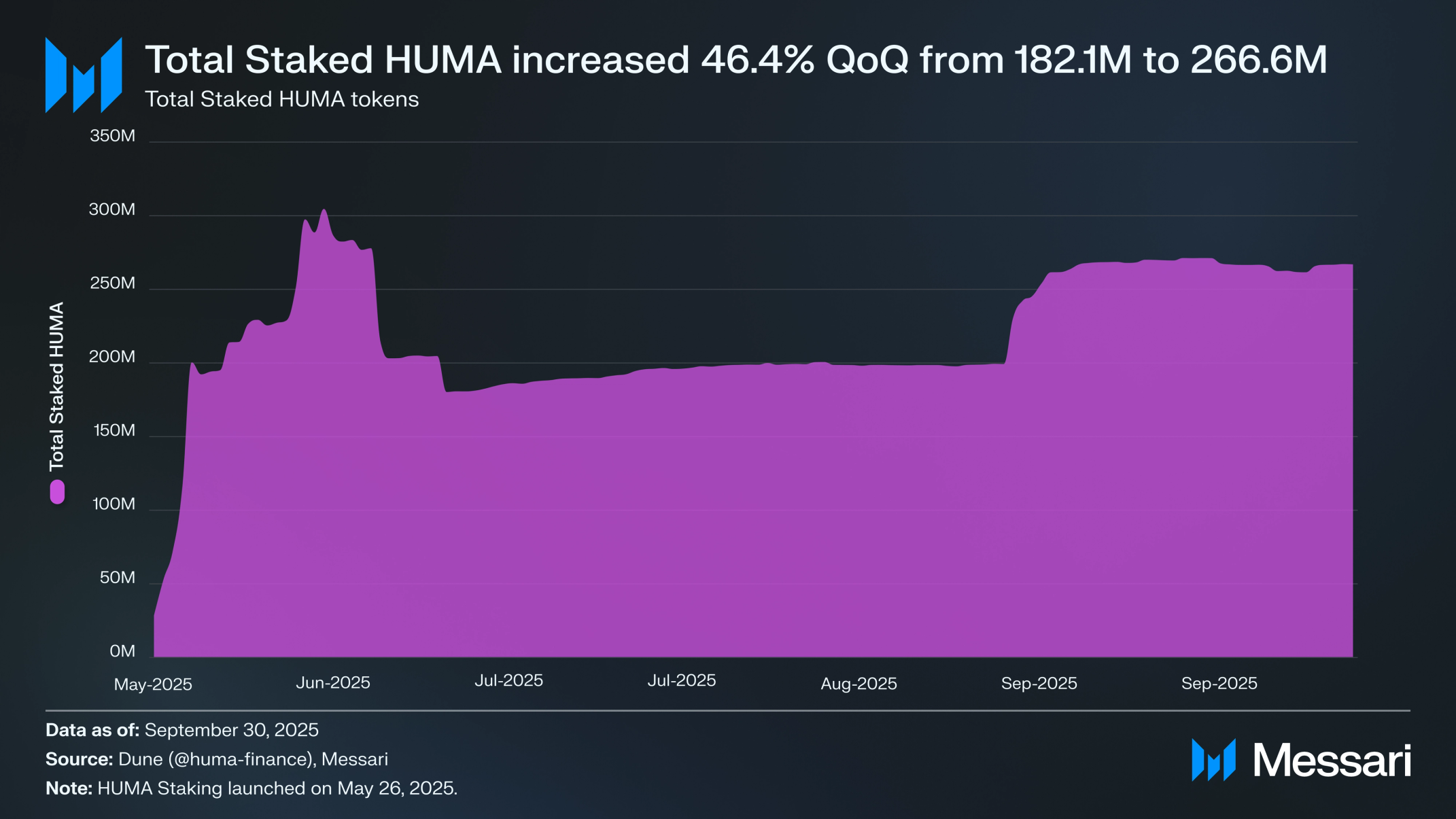 마켓메이킹 및 온체인 유동성에 할당된 4억 개를 제외한 모든 HUMA 유통 공급량은 스테이킹할 수 있다. 9월 30일 기준, 사용자들은 2억 6,660만 HUMA(910만 달러)를 스테이킹했으며, 이는 6월 30일 1억 8,210만 개 대비 전분기 대비 46.4% 증가한 수치로, 스테이킹 가능한 16억 7,000만 HUMA의 16.0%에 해당한다.