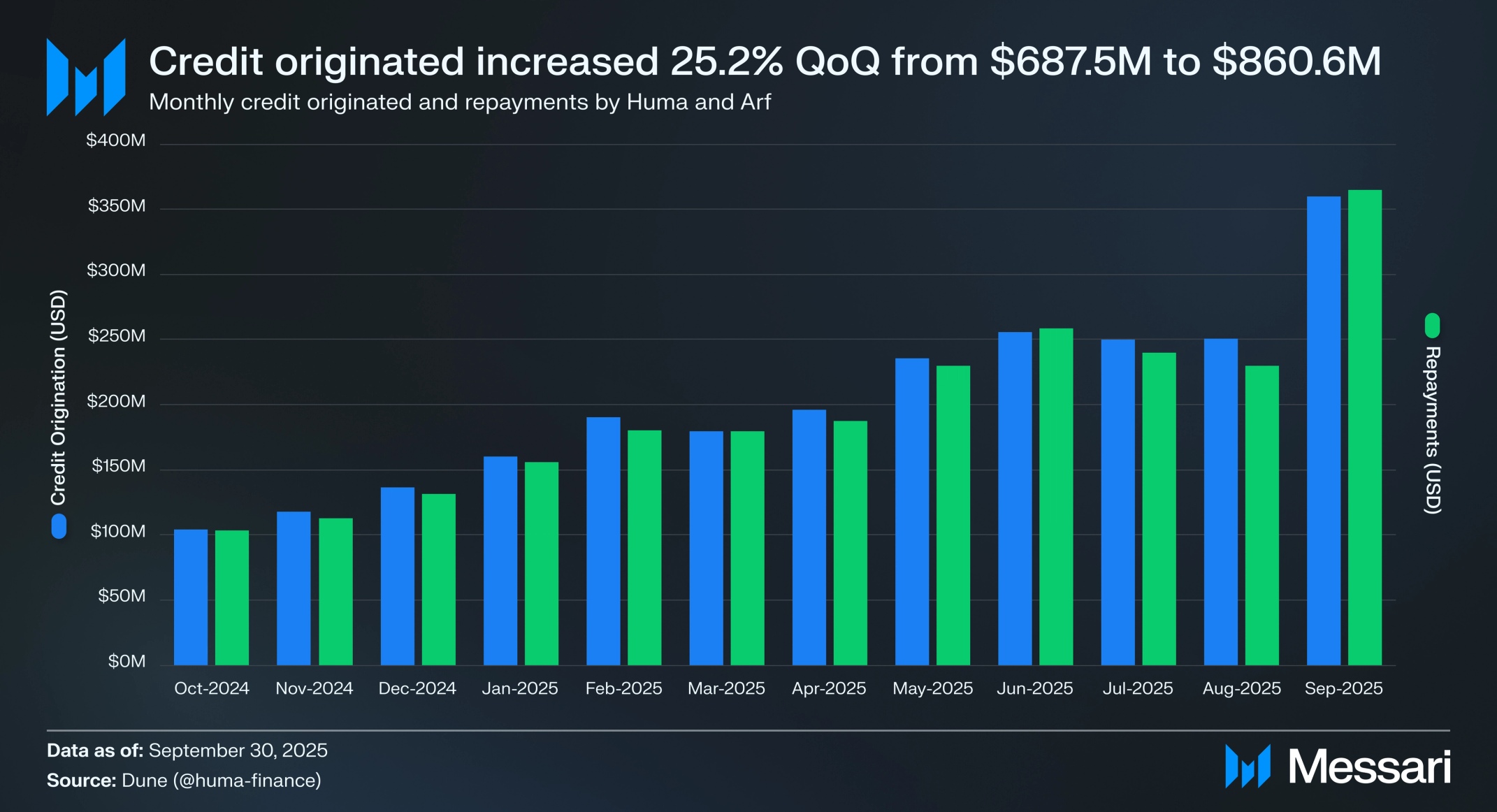 대출 실행은 활성 대출 풀을 통해 발행된 대출 가치를 의미하며, 대출 상환은 차입자가 상환한 원금을 의미한다. 3분기에 휴마 풀을 통한 실행액은 총 8억 6,060만 달러로, 6억 8,750만 달러에서 전분기 대비 25.2% 증가했다. 실행 및 상환을 포함한 모든 풀의 거래량은 같은 기간 동안 14억 달러에서 17억 달러로 전분기 대비 24.4% 증가했다. 이러한 증가는 대체 결제 금융 솔루션의 기관 사용 증가와 온체인 결제 및 대출 실행에 대한 관심 증가를 반영한다.