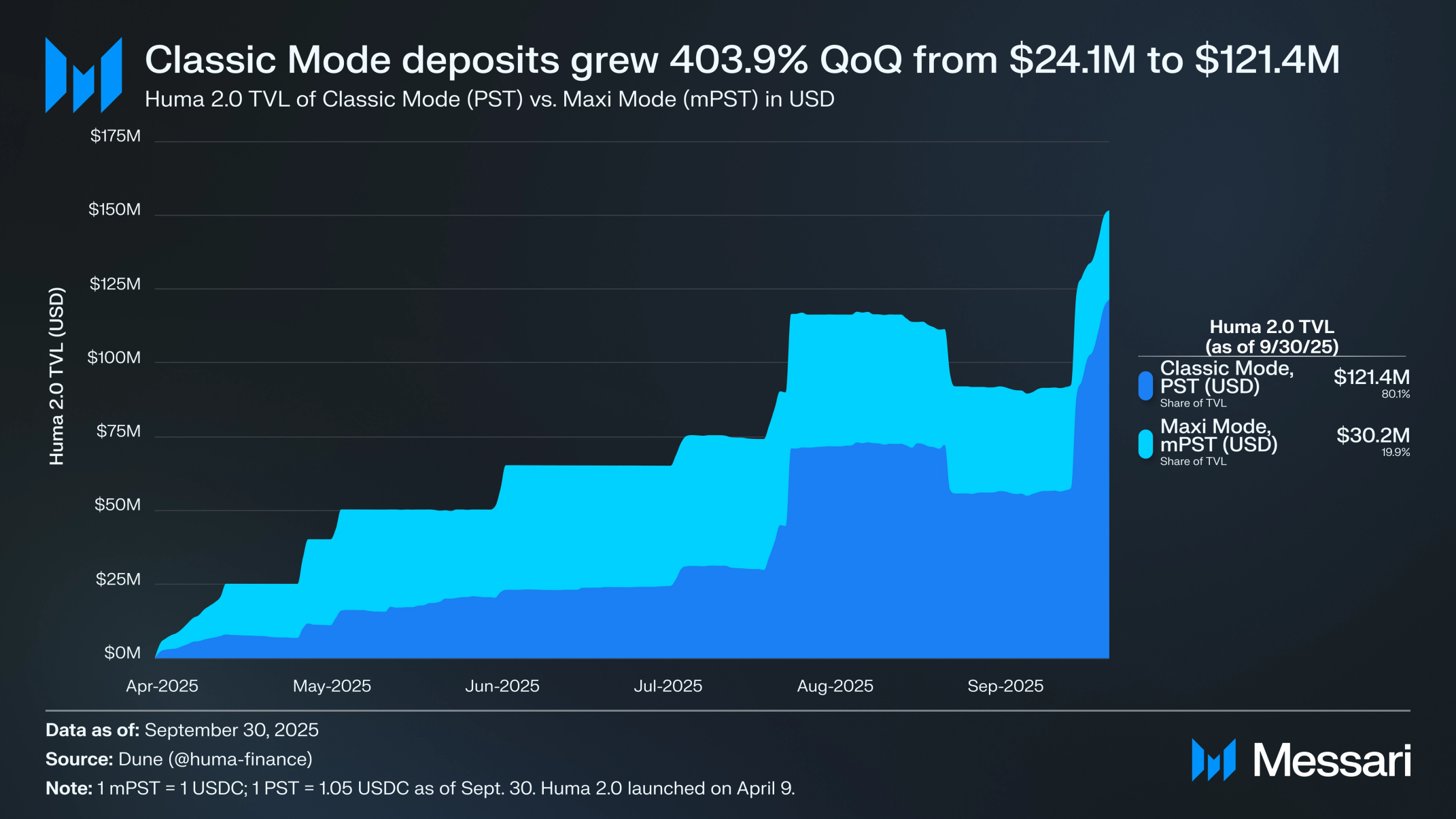 9월 30일 기준, 휴마 2.0의 예치금은 1억 5,160만 달러로, 2분기 말 6,510만 달러 대비 전분기 대비 132.3% 증가했다. 같은 기간 동안 클래식 보유액은 2,410만 달러에서 1억 2,140만 달러로 전분기 대비 403.9% 증가했으며, 맥시 보유액은 4,110만 달러에서 3,020만 달러로 전분기 대비 26.7% 감소했다. 9월 24일, 클래식 모드는 3,070만 달러의 유입을 기록하여 3분기 중 일일 최대 증가를 보였다. 9월 24일, 바이낸스 월렛(Binance Wallet)은 클래식 모드 예치 지원을 추가하고 50 USDC를 예치한 사용자가 30만 달러 상당의 HUMA를 공유할 수 있는 캠페인을 시작했으며, 이는 급증에 기여했을 가능성이 있다. 변동 가능한 페더 보상보다 스테이블코인 표시 연이율(APY)에 대한 사용자 선호도와 3분기 전반에 걸친 낮은 페더 보상 배율이 해당 분기 동안 클래식 예치의 지속적인 증가에 기여했을 가능성이 있다.