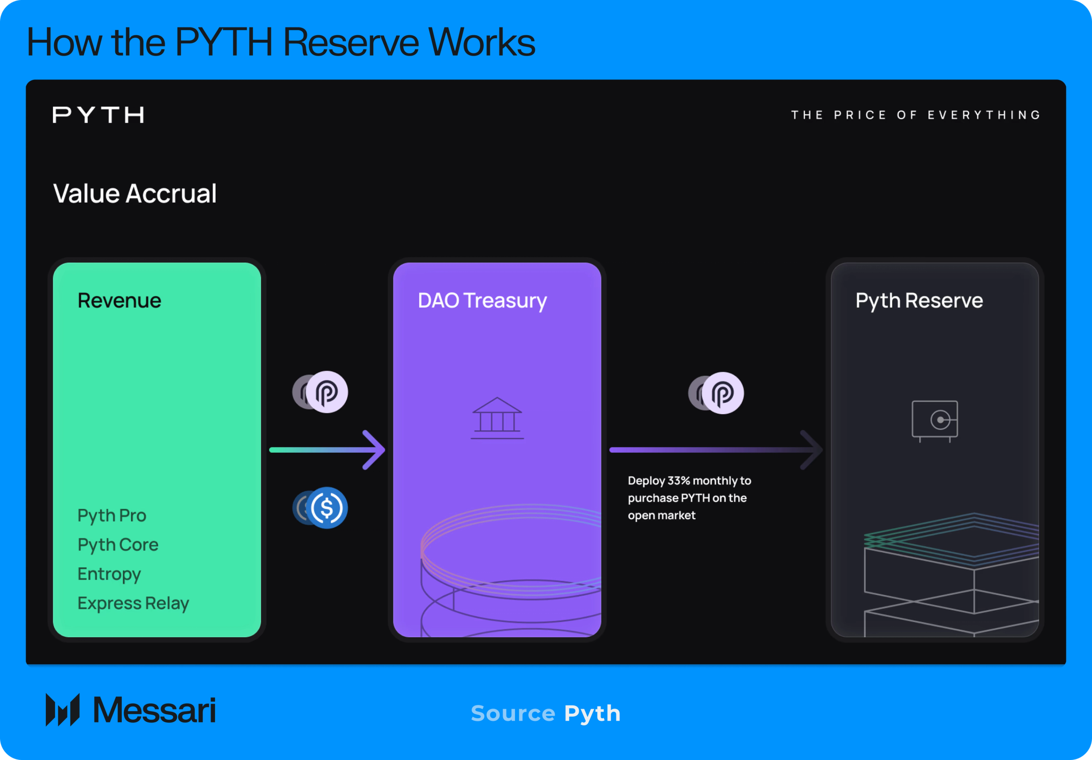 그러나 2025년 12월, 피스는 PYTH 리저브를 도입하여 프로토콜 수익과 직접 연결된 가치 포착 메커니즘을 공식화했다. 피스의 제품 표면(피스 프로, 피스 코어 가격 피드(Pyth Core price feeds), 엔트로피, 익스프레스 릴레이)에서 생성된 모든 수익은 다오 재무로 통합된다. 매달 다오는 재무 잔액의 3분의 1(33%)을 공개 시장에서 PYTH를 구매하는 데 배치한다. 동시에 피티안 카운슬(Pythian Council)은 이제 코어, 엔트로피 및 익스프레스 릴레이에 걸쳐 체계적인 분기별 가격 검토를 수행하며, 온체인 성과 데이터와 경쟁 벤치마크를 사용하여 채택을 유지하면서 수수료를 최적화한다. 이러한 메커니즘들은 함께 PYTH의 이코노믹스를 인플레이션 인센티브나 투기적 수수료 가정이 아닌 반복적인 제품 사용과 규율 있는 수익화에 고정한다.