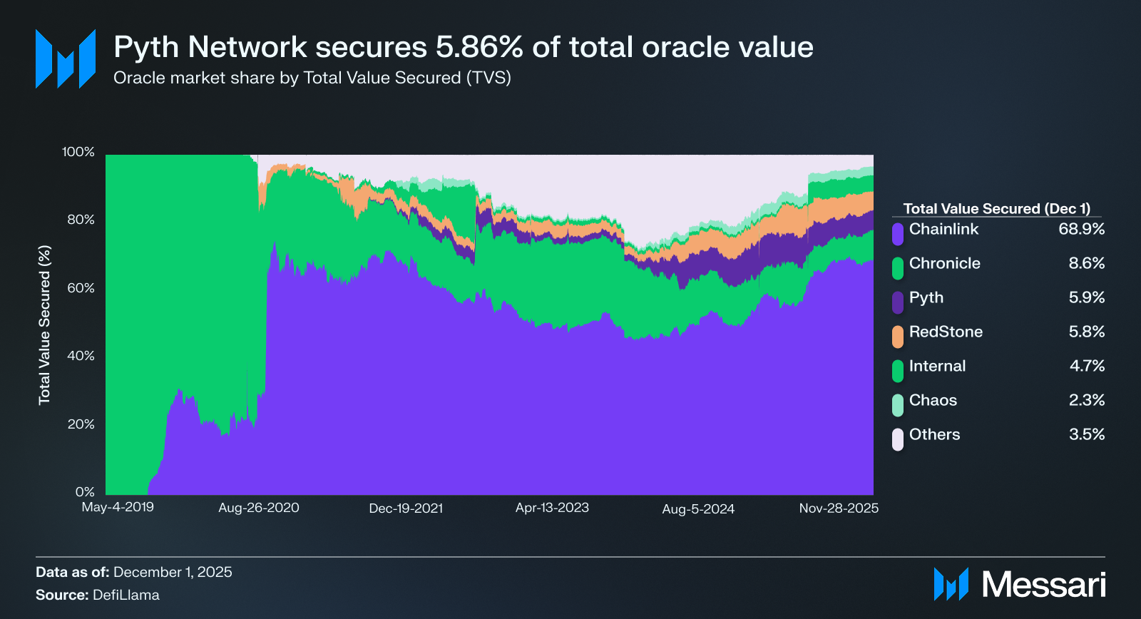 2025년 중반까지 네트워크는 온체인 및 오프체인 거래소에서 23억 달러의 누적 거래량을 달성했고, 제인 스트리트(Jane Street), Cboe, 점프 트레이딩(Jump Trading), DRW, 옵티버(Optiver)를 포함한 125개 이상의 기관으로부터 가격 기여를 유치했으며, 650개 이상의 온체인 애플리케이션에 통합되었다. 이를 관점에서 보면, 2025년 12월 1일 기준, 피스는 301개 프로토콜에서 60억 달러 이상의 가치를 확보하여, 확보된 가치 기준 전체 오라클 시장 점유율의 5.9%를 나타내며 전 세계 상위 3대 오라클 제공업체 중 하나로 자리매김했다.