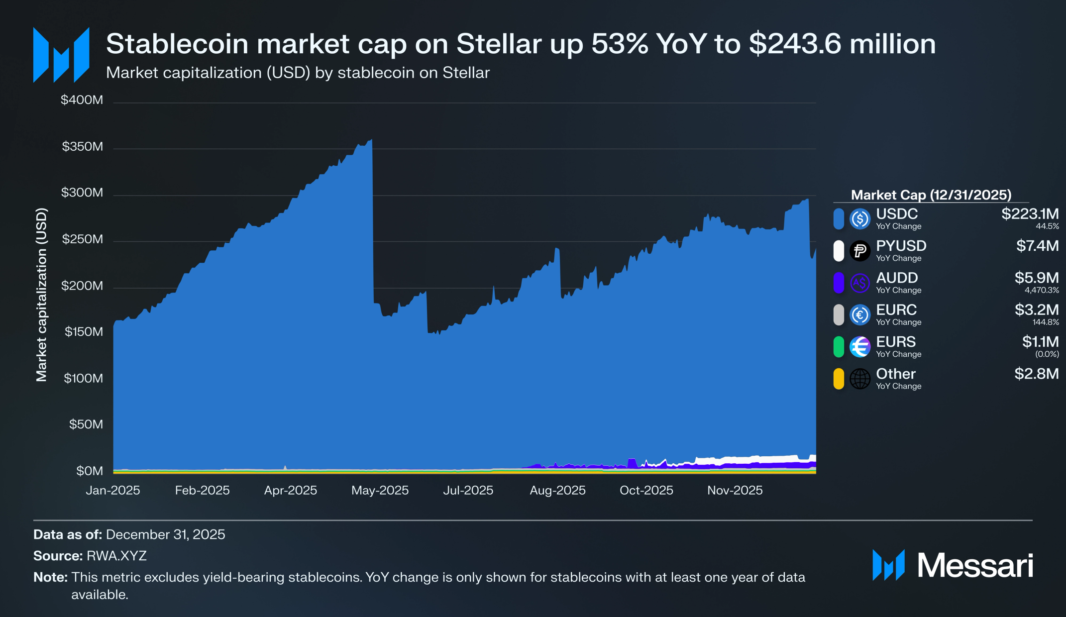 2025년 스텔라의 스테이블코인 시가총액은 전년 대비 53% 증가하여 1억 5,900만 달러에서 2억 4,360만 달러로 성장했으며, 이는 USDC의 전년 대비 44.5% 증가로 2억 2,310만 달러를 기록한 것과 2025년 9월 페이팔의 PYUSD 네트워크 출시에 따른 것이다. PYUSD의 출시는 페이팔의 기존 금융 인프라와 통합된 PYUSD를 이미 잘 알고 직접 사용하는 사람들에게 특히 유용하다. 또한 이는 네트워크에서 제공되는 두 번째 주요 미국 달러 스테이블코인으로, 일상적인 거래에 대한 거의 즉각적인 결제와 마찰 감소를 제공하며 소규모 기업을 위한 페이파이(PayFi) 솔루션에 대한 접근을 제공한다.