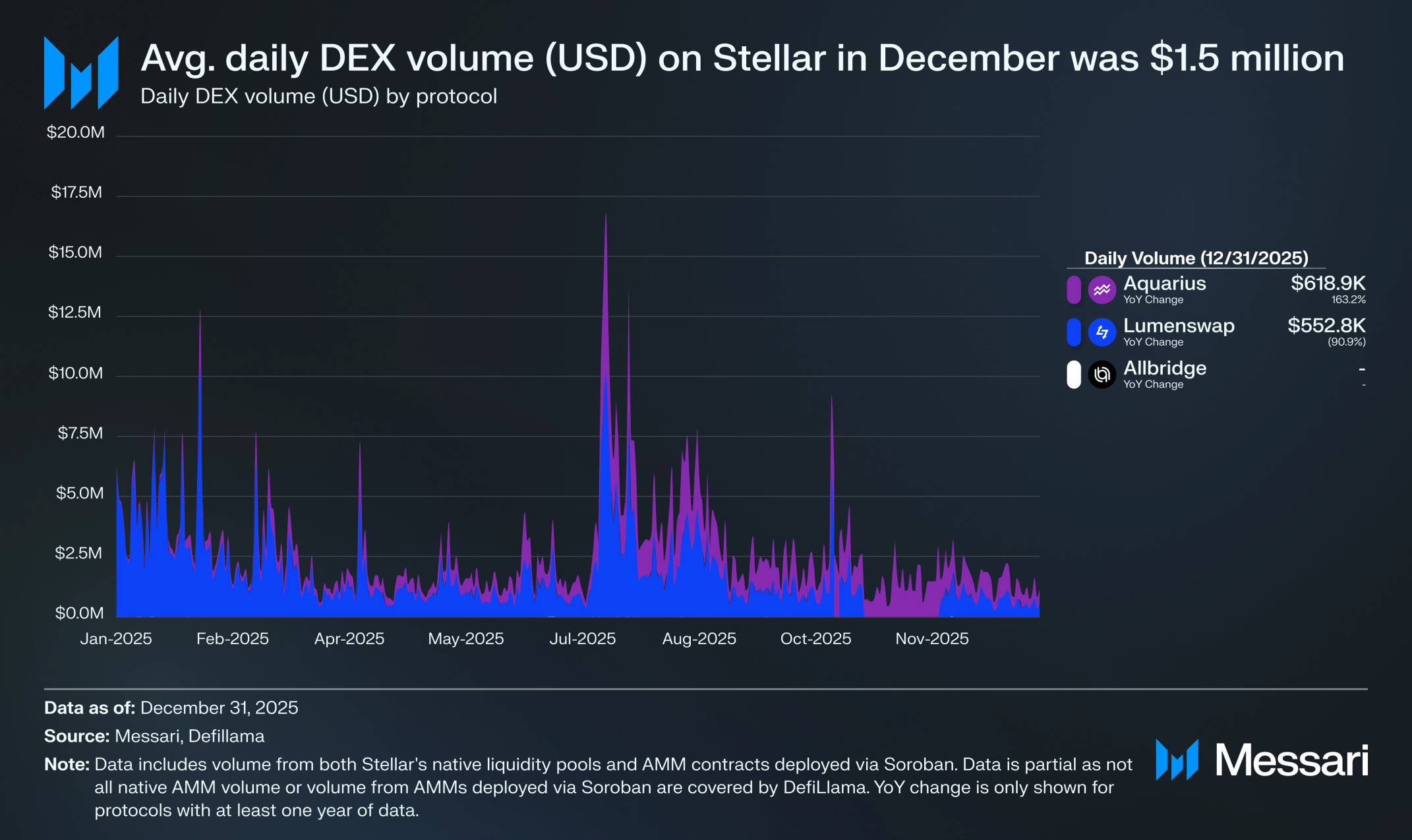 2025년 12월 스텔라의 평균 일일 DEX 거래량(USD)은 150만 달러였다. 특히 아쿠아리우스는 2025년 4분기에 1억 480만 달러의 거래량을 기록했으며, 이는 루멘스왑(Lumenswap)의 6,390만 달러보다 63.9% 많은 수치이다. 그러나 루멘스왑은 2025년 1분기, 2분기, 3분기에 아쿠아리우스를 앞질렀다. 루멘스왑은 스텔라의 탈중앙화 거래소(SDEX) 및 네이티브 유동성 풀을 위한 프론트엔드 인터페이스이며, 아쿠아리우스는 스텔라에 배포된 소로반 기반 DEX이다.