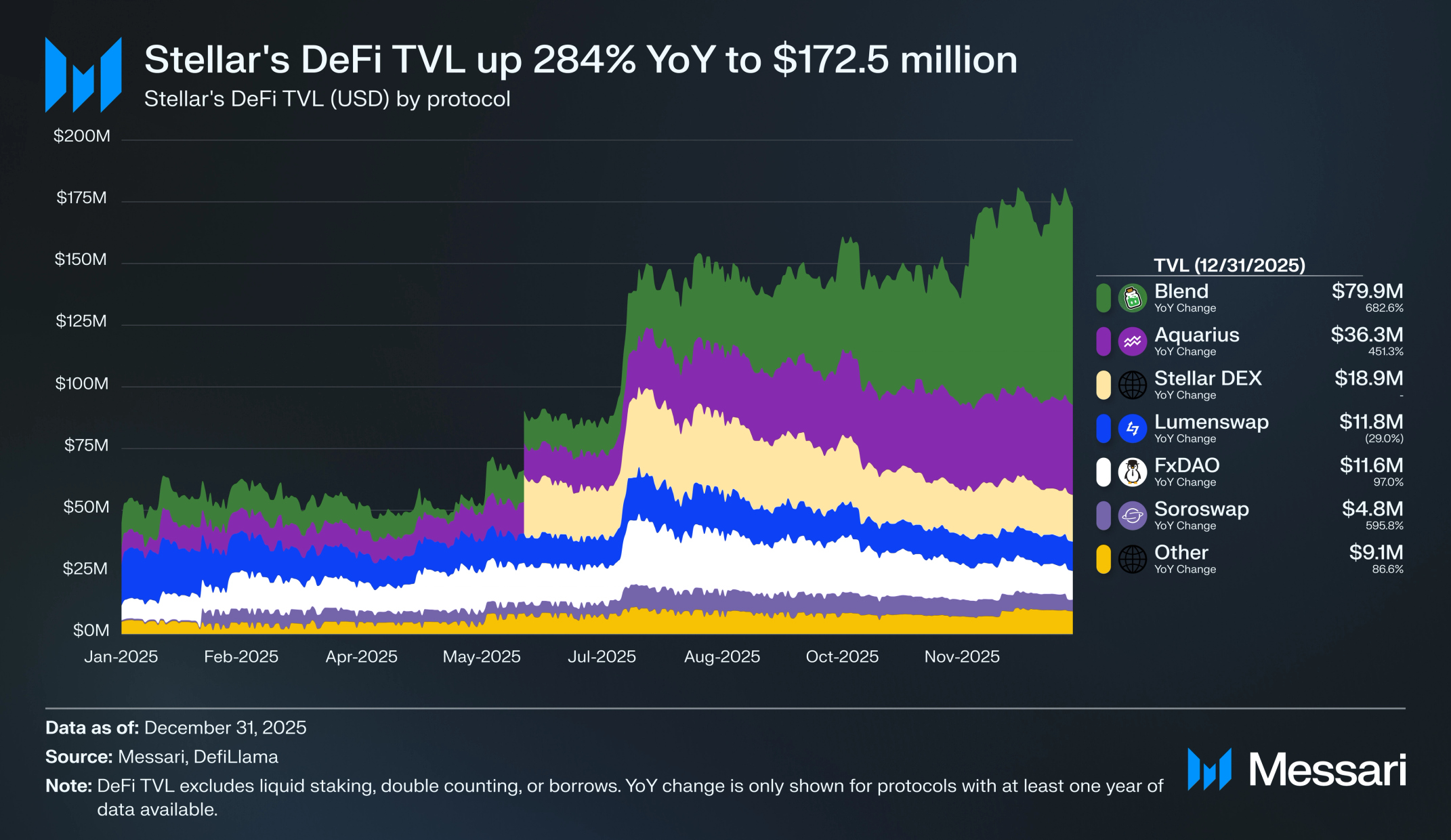 2025년에 뛰어난 TVL 성장을 기록한 기타 주목할 만한 프로토콜로는 DEX 아쿠아리우스(Aquarius, 전년 대비 +451%로 3,630만 달러), 초과담보 XLM 대출 및 스테이블코인 차입 프로토콜 FxDAO(전년 대비 +97%로 1,160만 달러), DEX 소로스왑(Soroswap, 전년 대비 +86.6%로 480만 달러)이 있다.