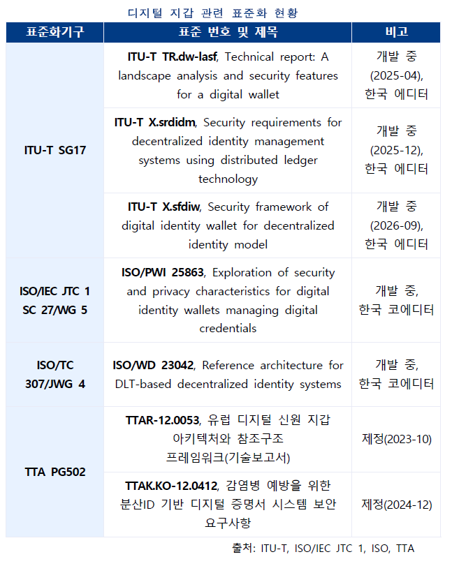추진 현황: ITU-T, ISO/IEC JTC 1, TTA 등에서 표준화를 추진 중이며, 전체적인 표준화는 초기 단계이나 '디지털 신원 지갑(Digital identity wallet)' 분야는 활발히 진행 중입니다.