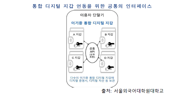 공통 인터페이스: 이기종 지갑 간 연동을 위해 식별/인증, 정보 조회, 정보 전송, 정보 이용 등의 기능을 포함한 API 표준화가 필요합니다.